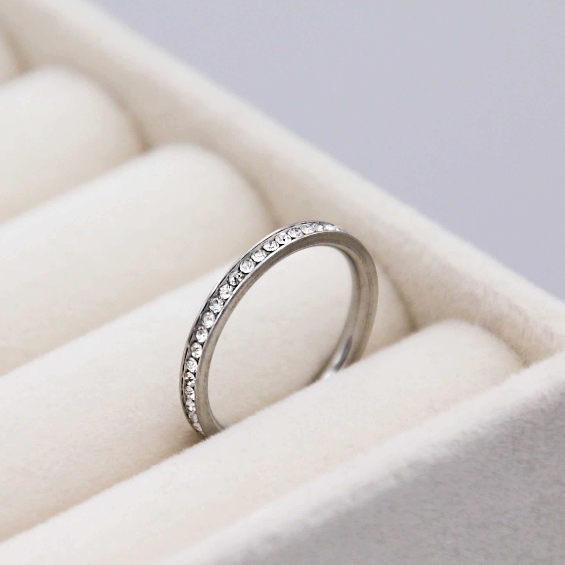 Ezüst színű gyűrű cirkónia kristályokkal.