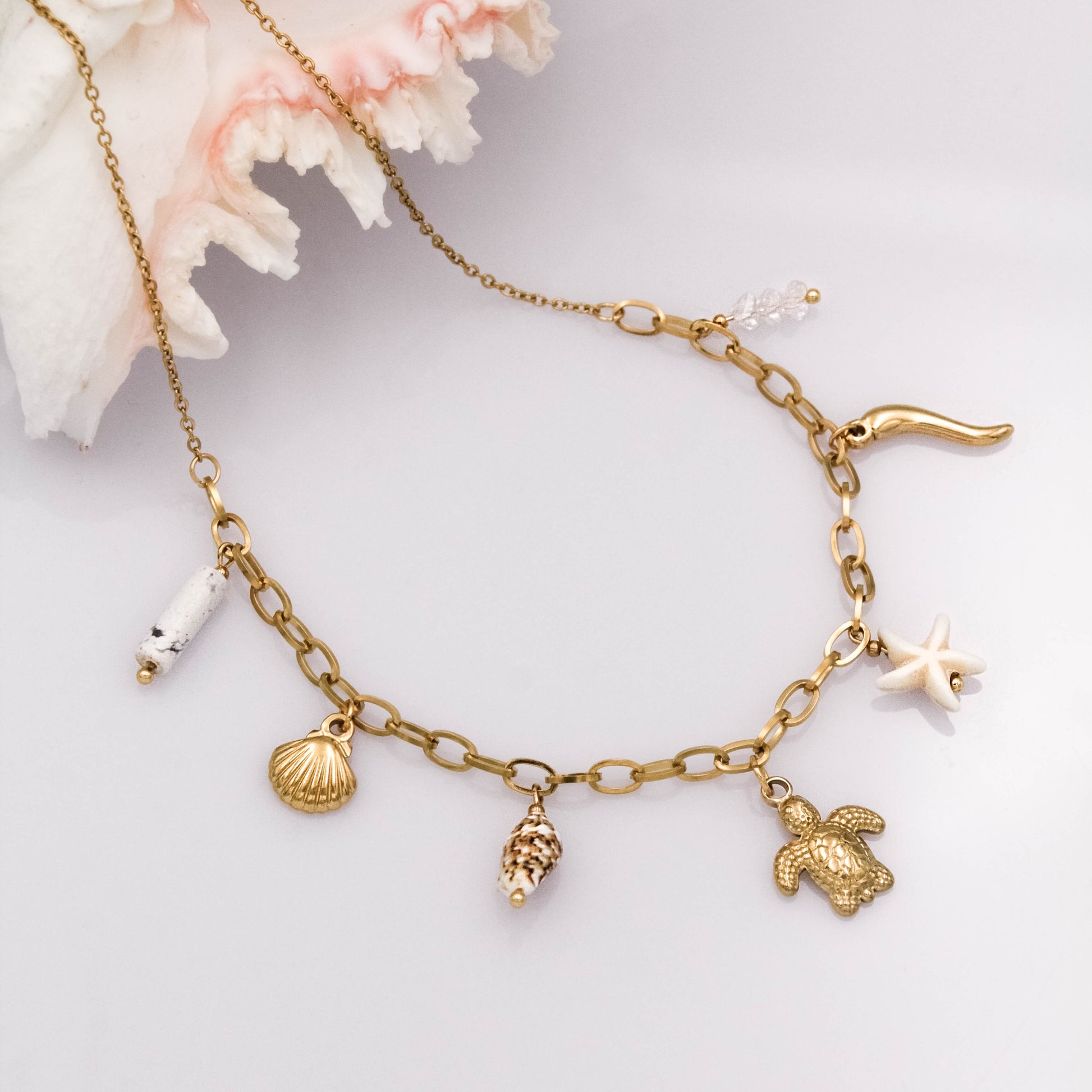 - Anyaga: aranyozott rozsdamentes nemesacél, fehér türkiz ásvány, üveggyöngyök, csigakagyló.