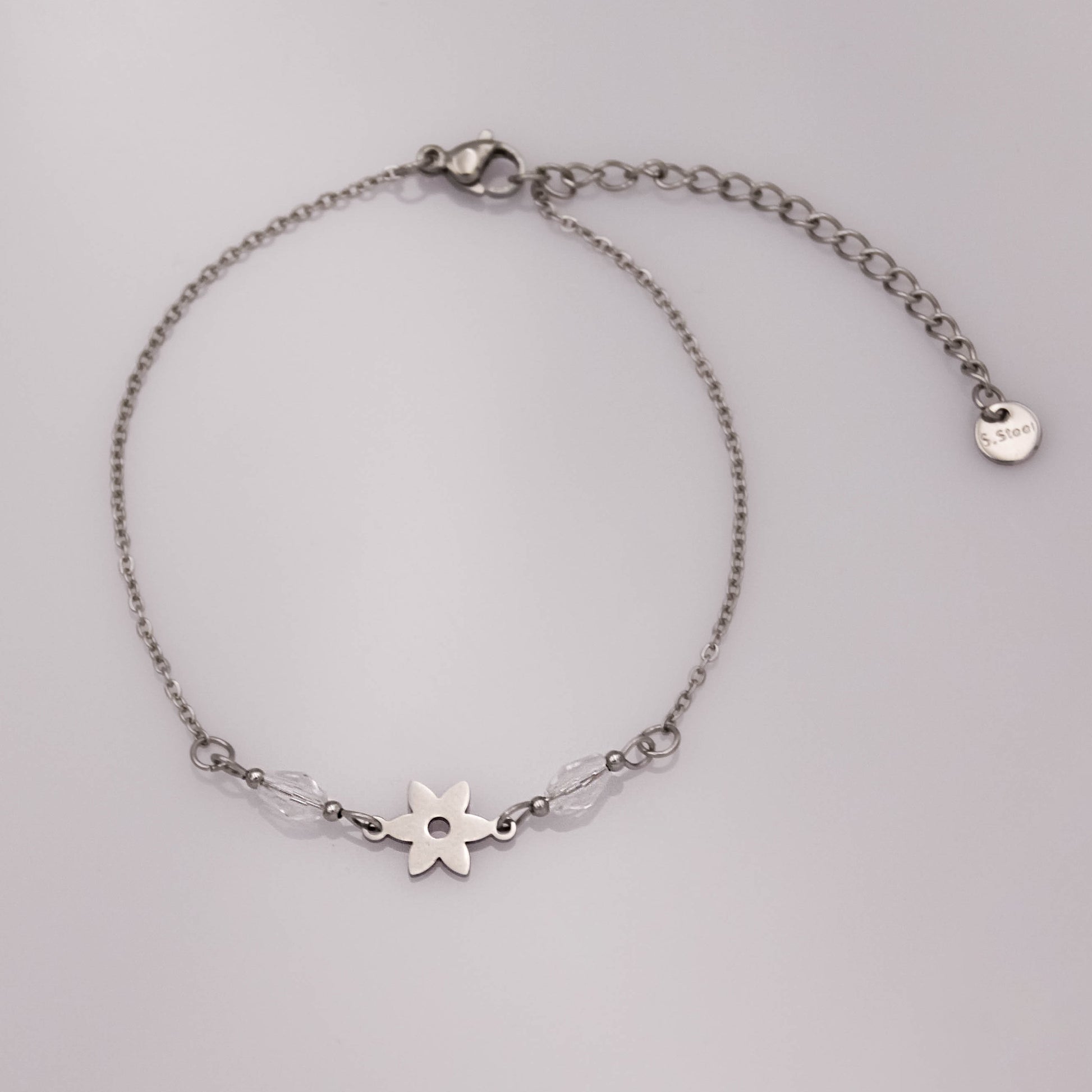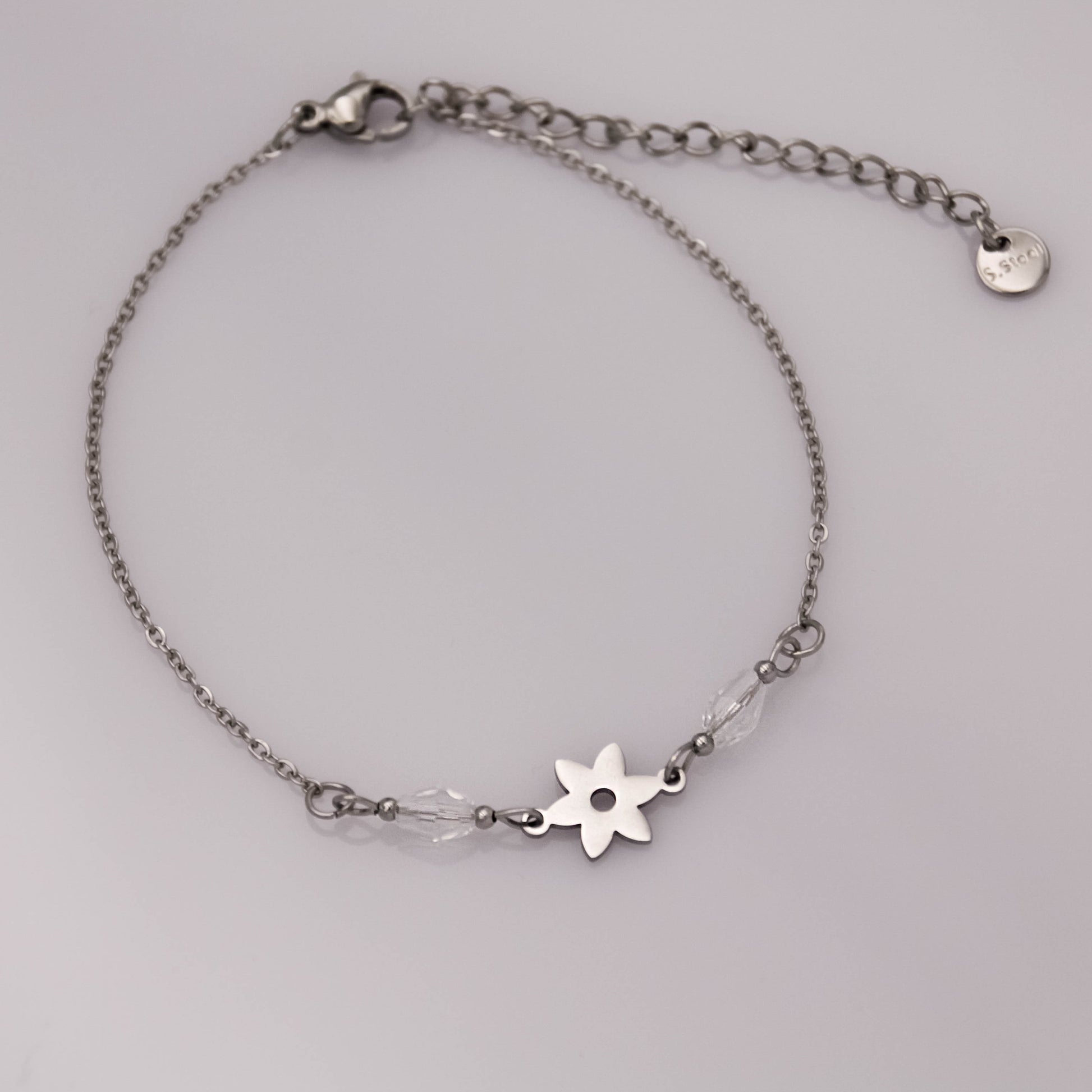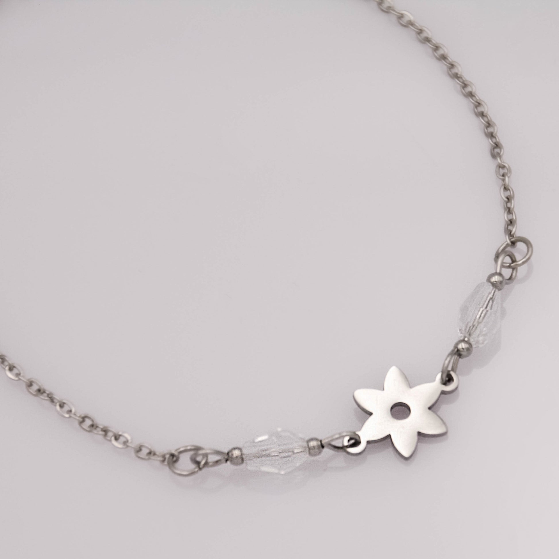 Ezüst színű karkötő áttetsző üveggyöngyökkel és virág medállal.