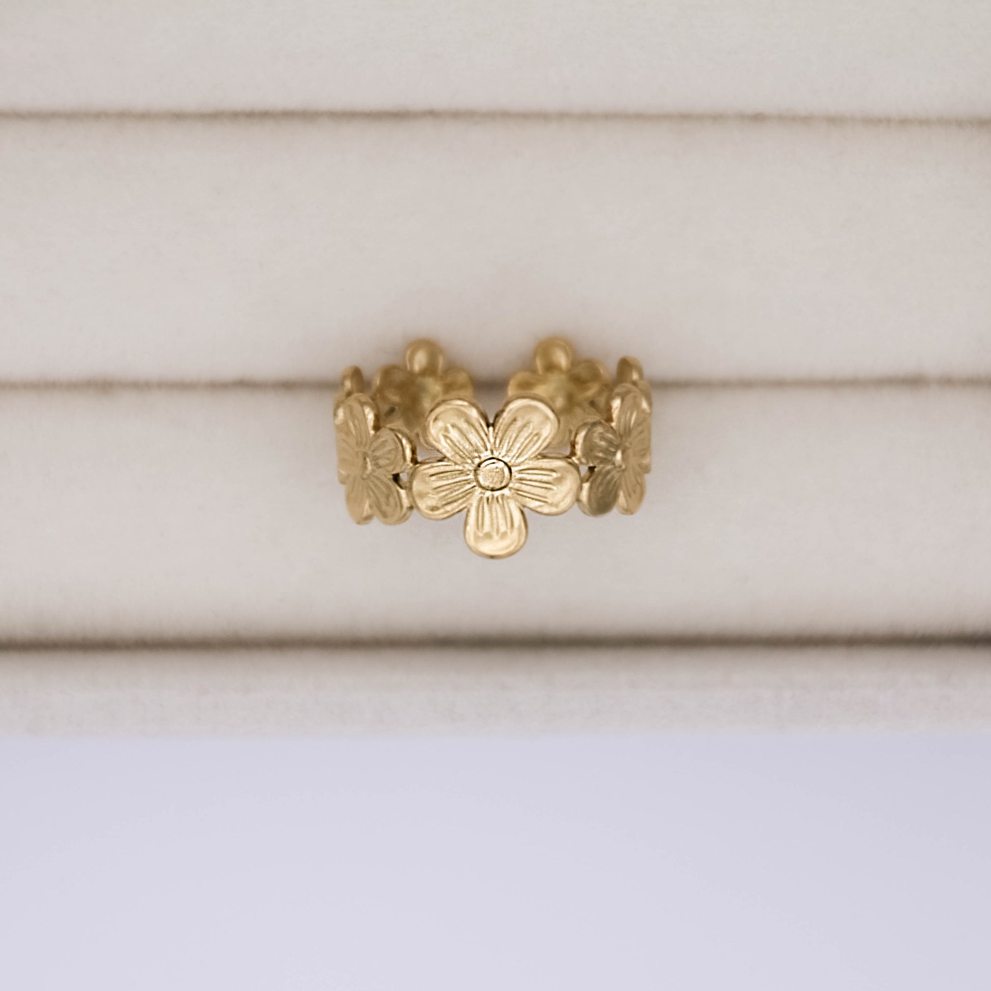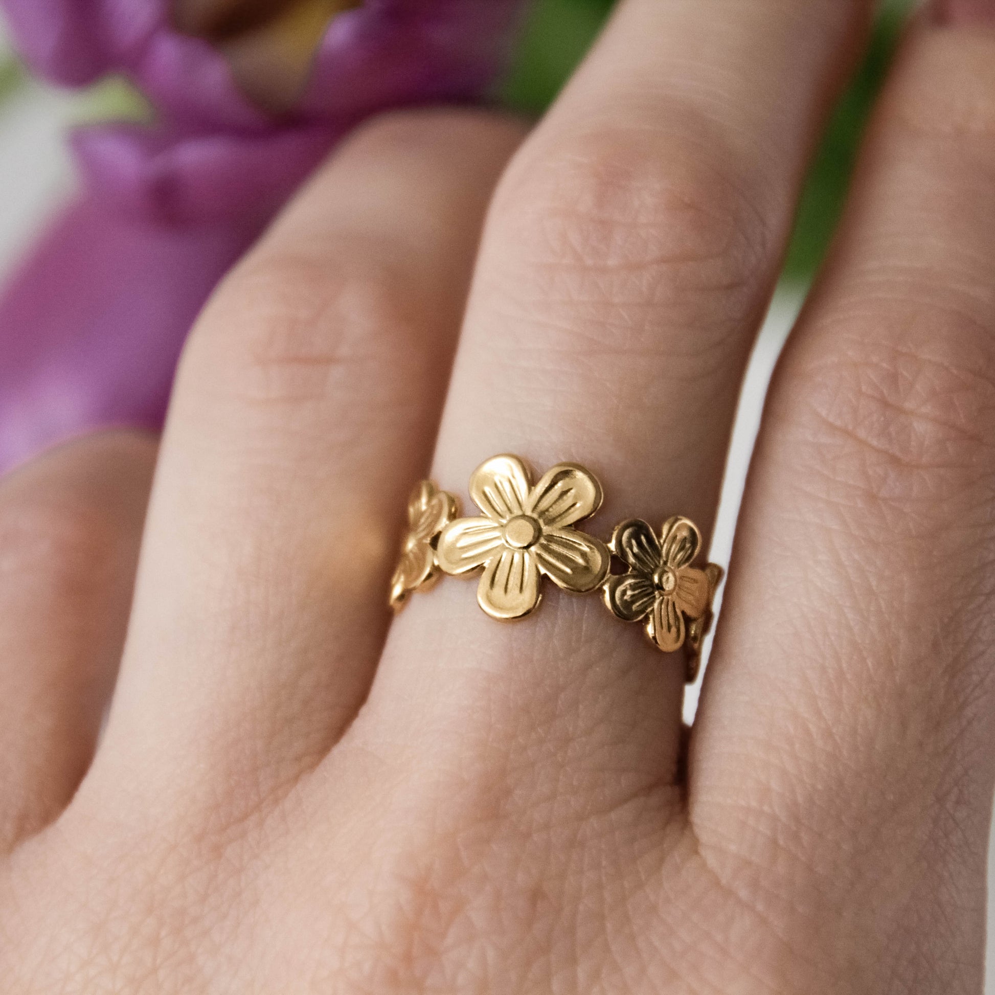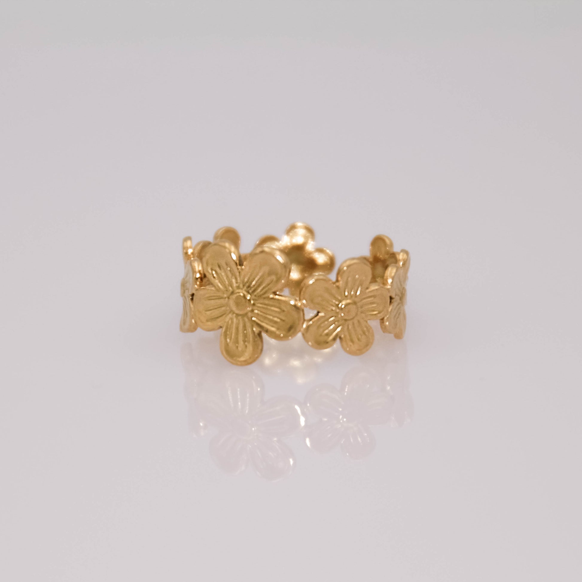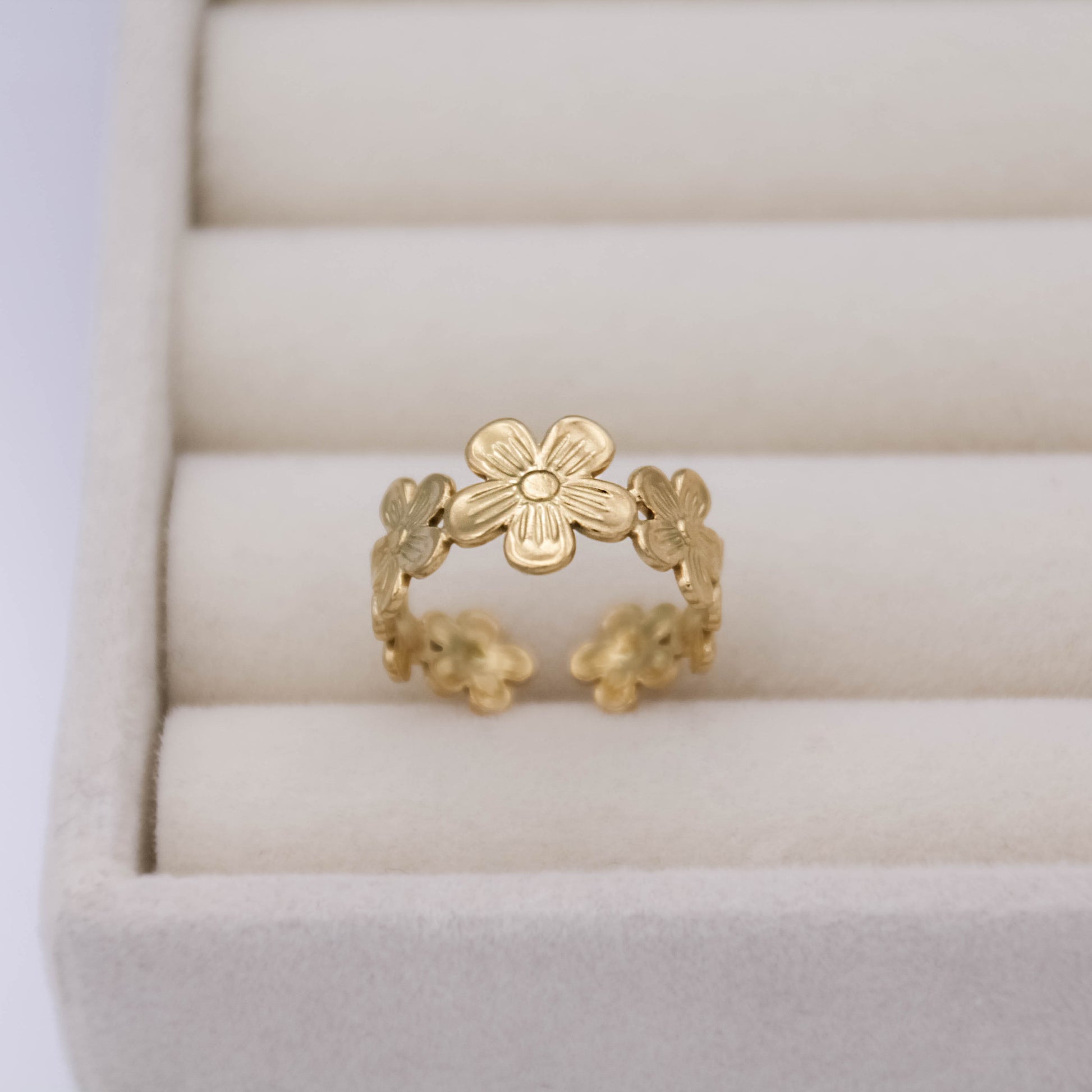 Arany színű, állítható méretű, virágokból álló gyűrű.