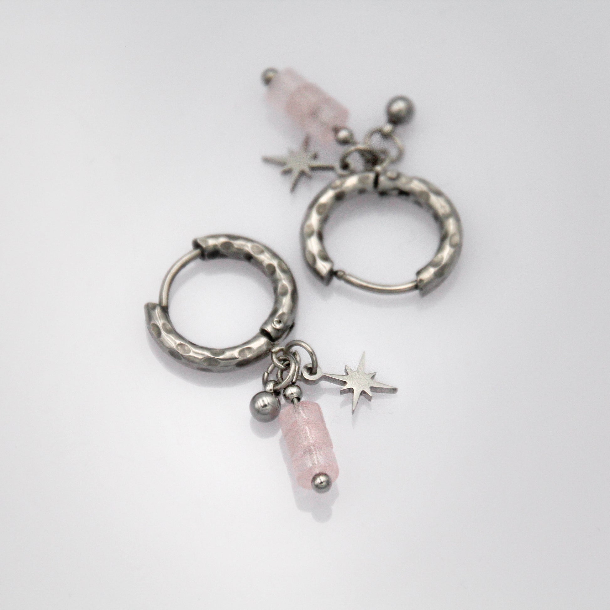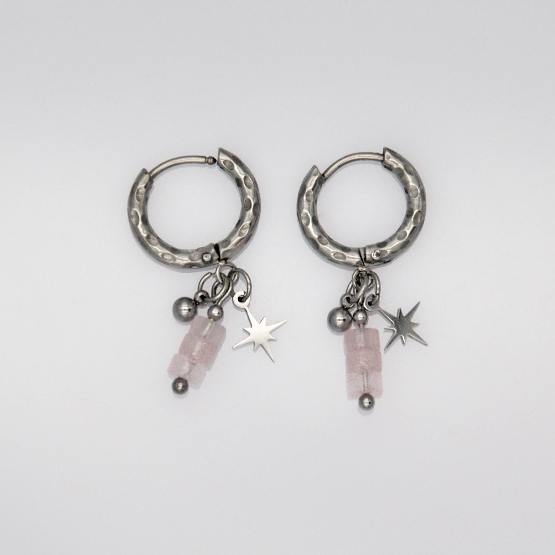 Ezüst színű fülbevaló rózsakvarc gyöngyökkel, ezüst színű csillag- és bogyó medállal.