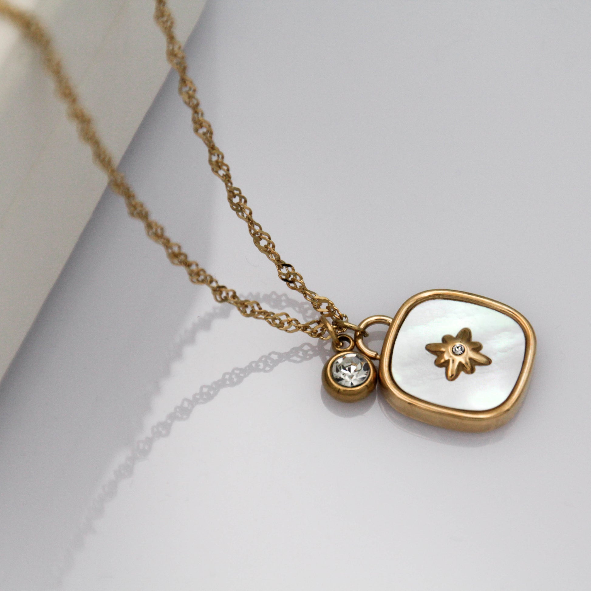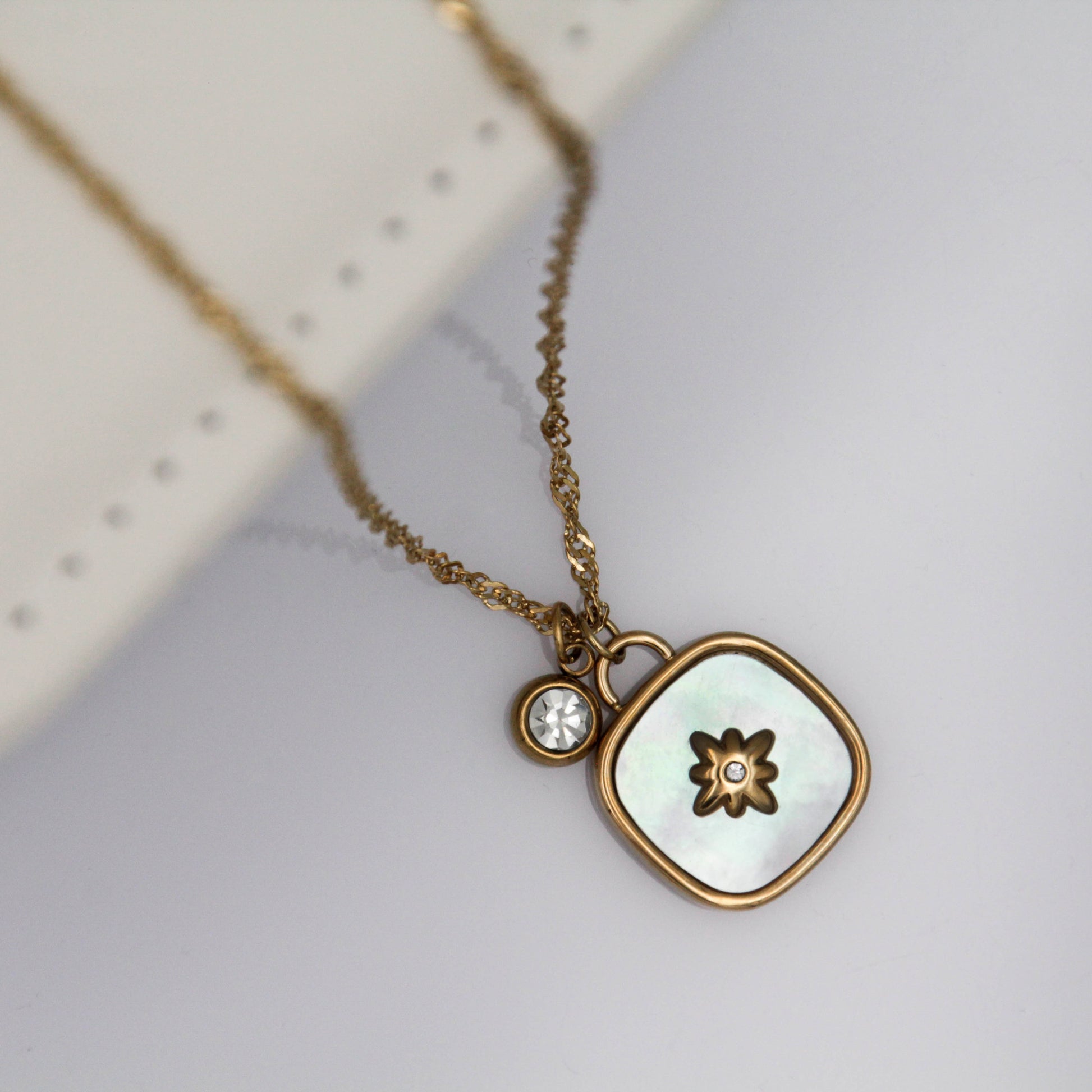 - Anyaga: aranyozott rozsdamentes nemesacél, kagylóhéj, cirkónia kristály