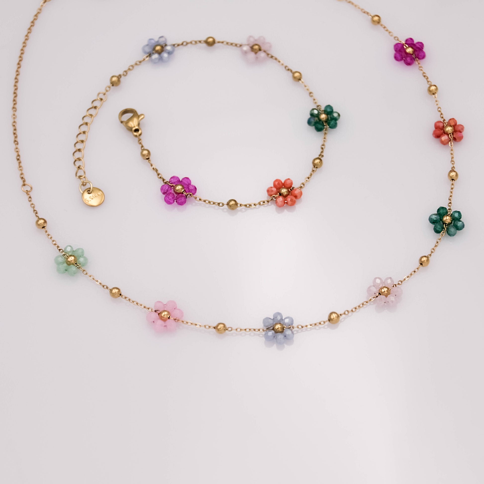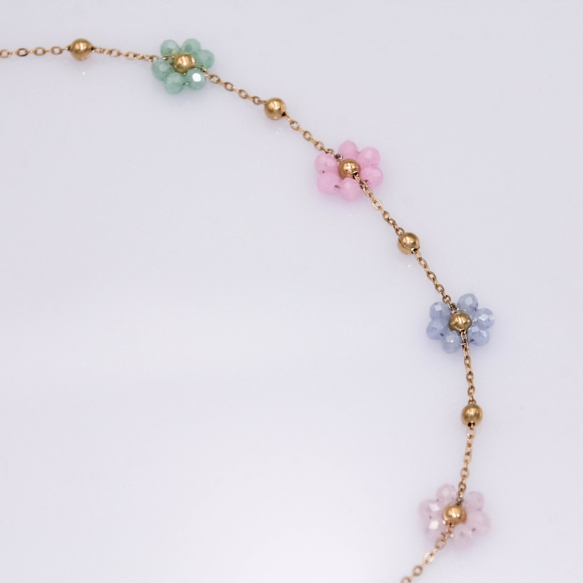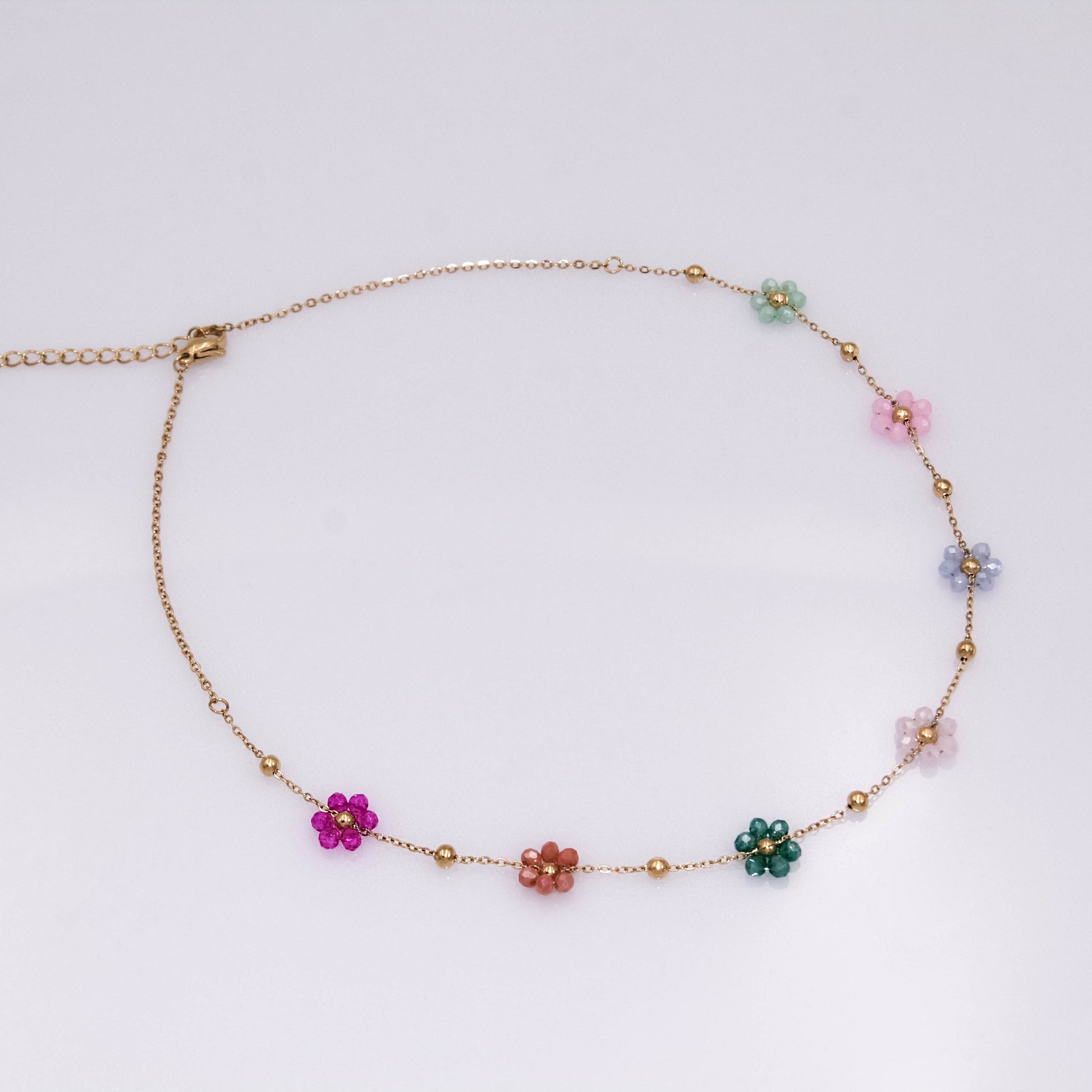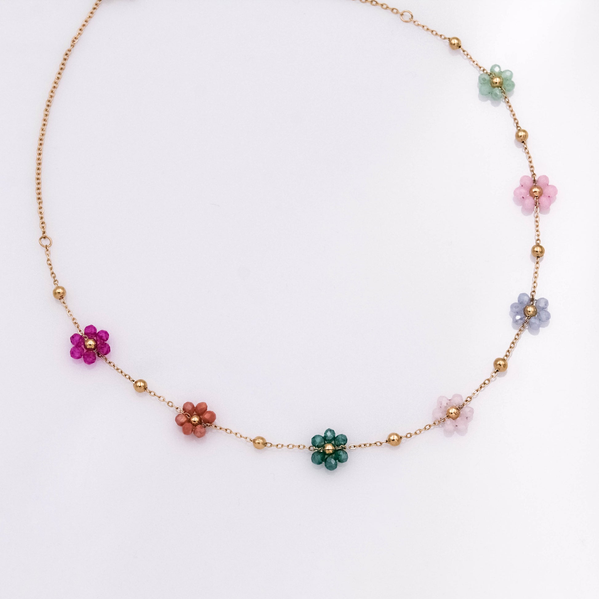 Arany színű nyaklánc színes virágokkal.