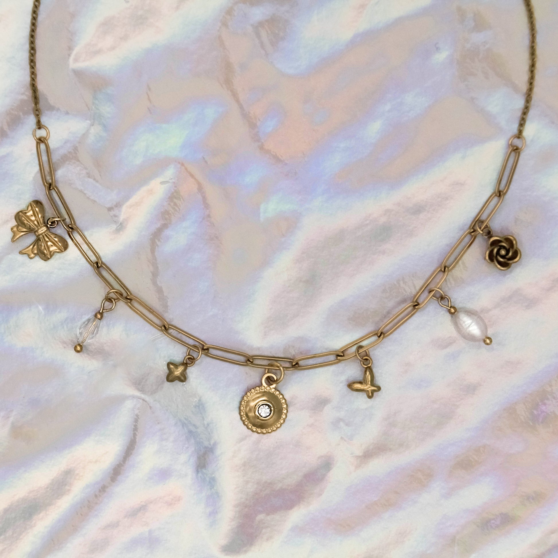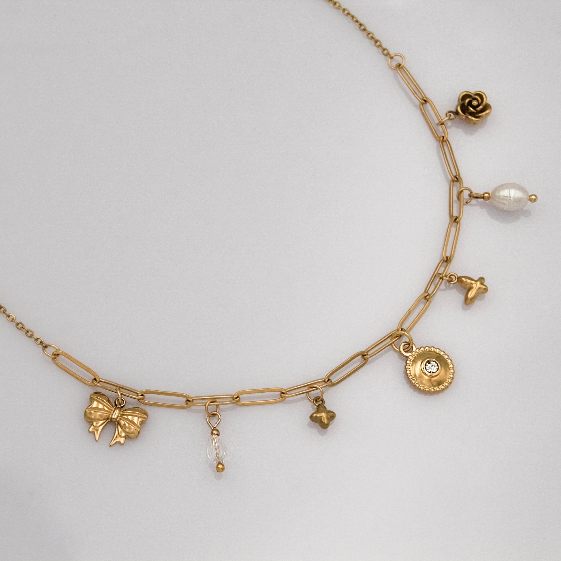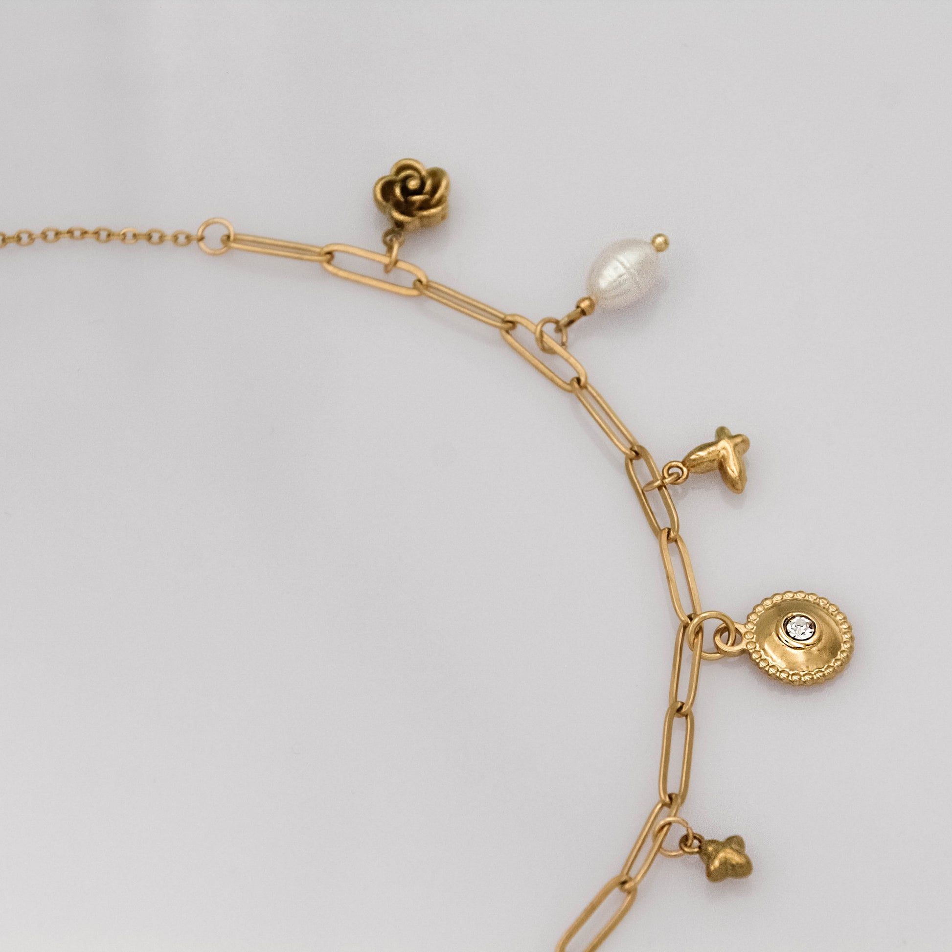 - Anyaga: aranyozott rozsdamentes nemesacél, üveggyöngy, cirkónia kristály, tenyésztett édesvízi gyöngy.