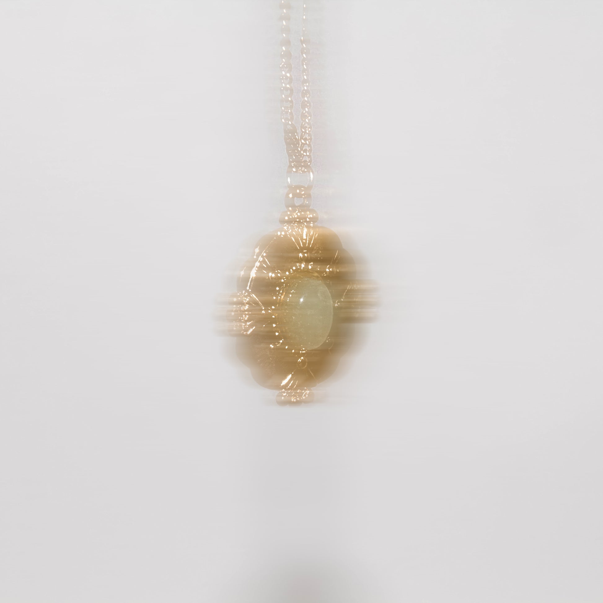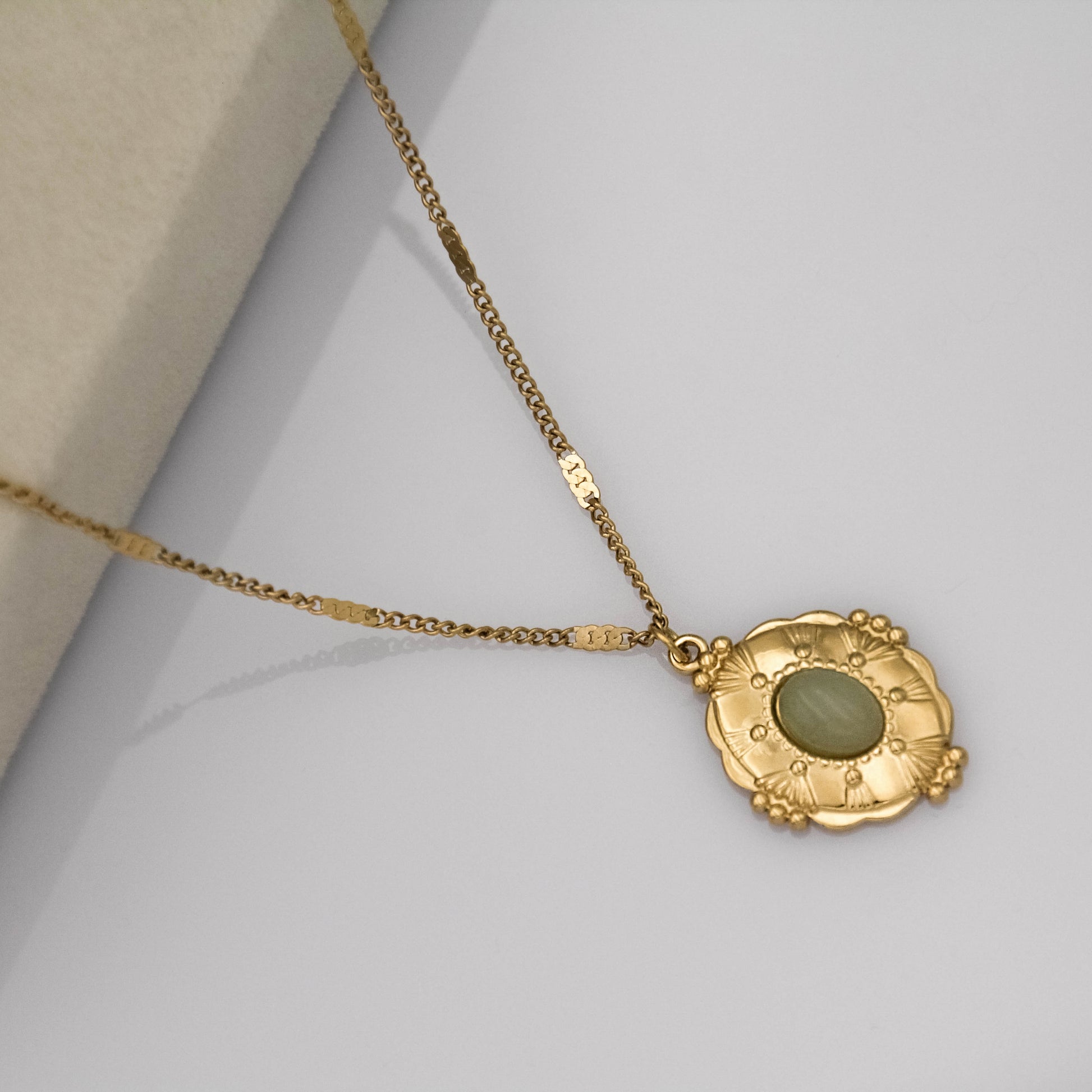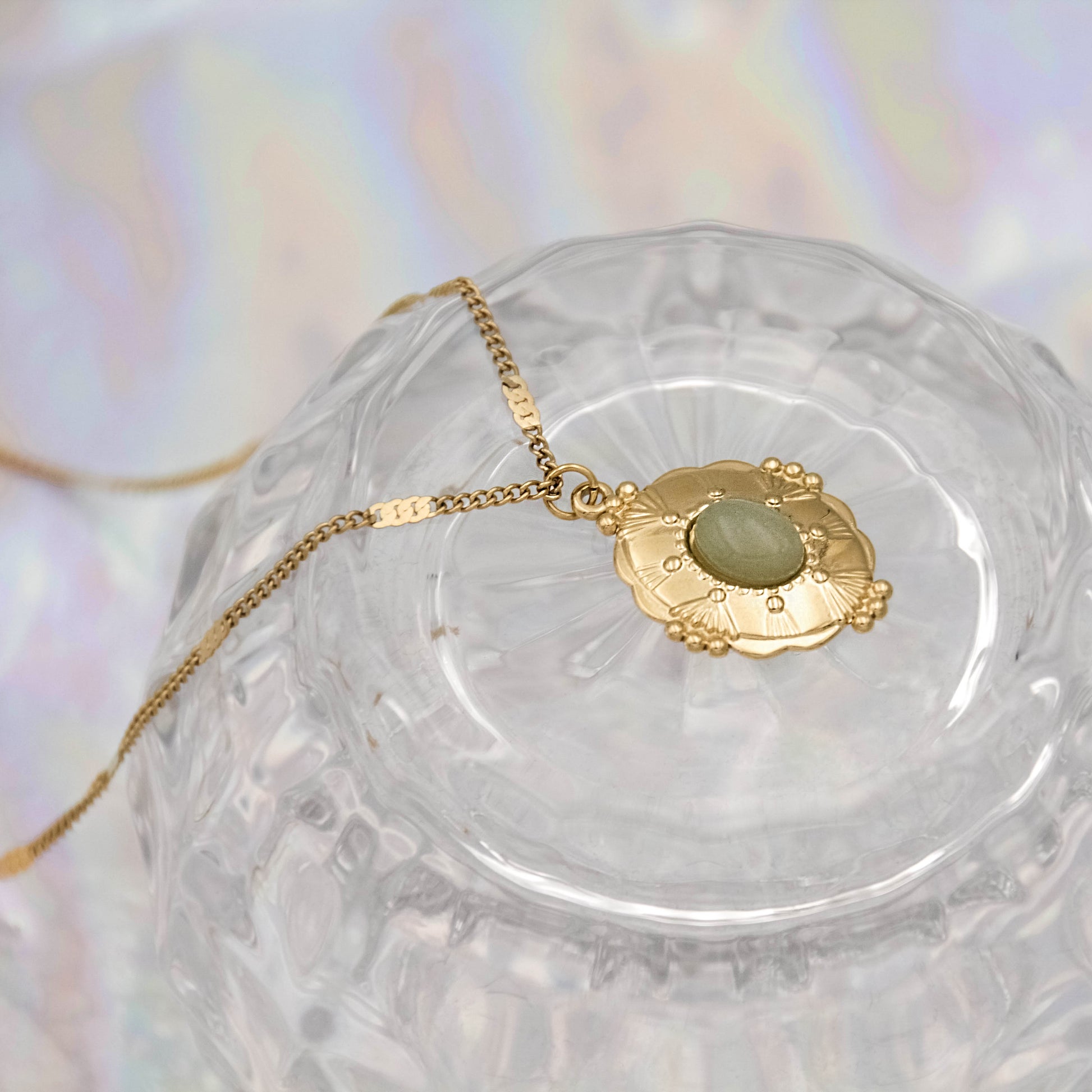 Arany színű nyaklánc halványzöld berakású díszes medállal.