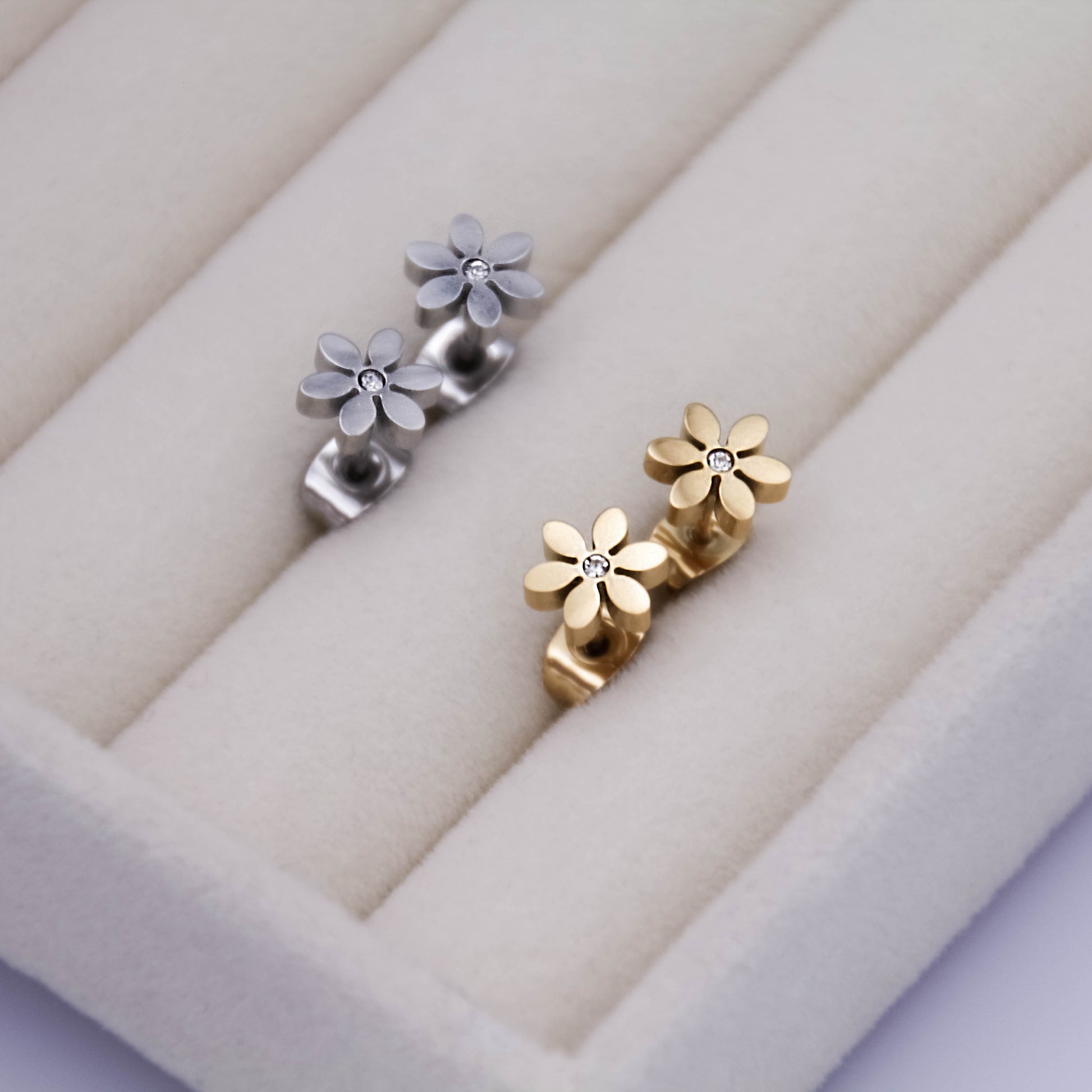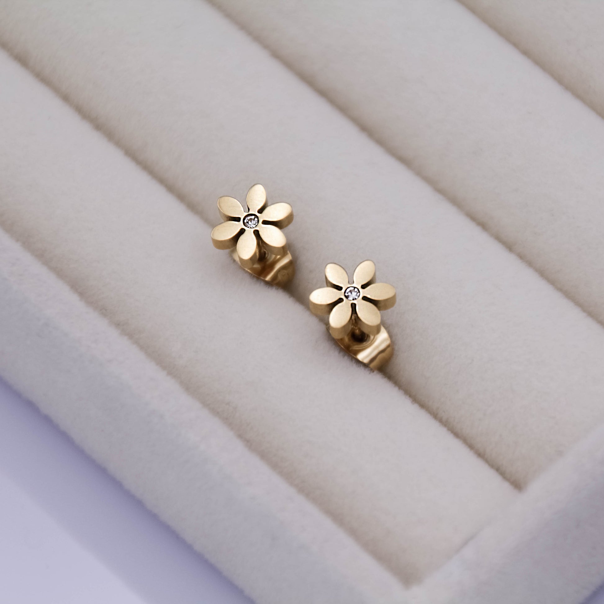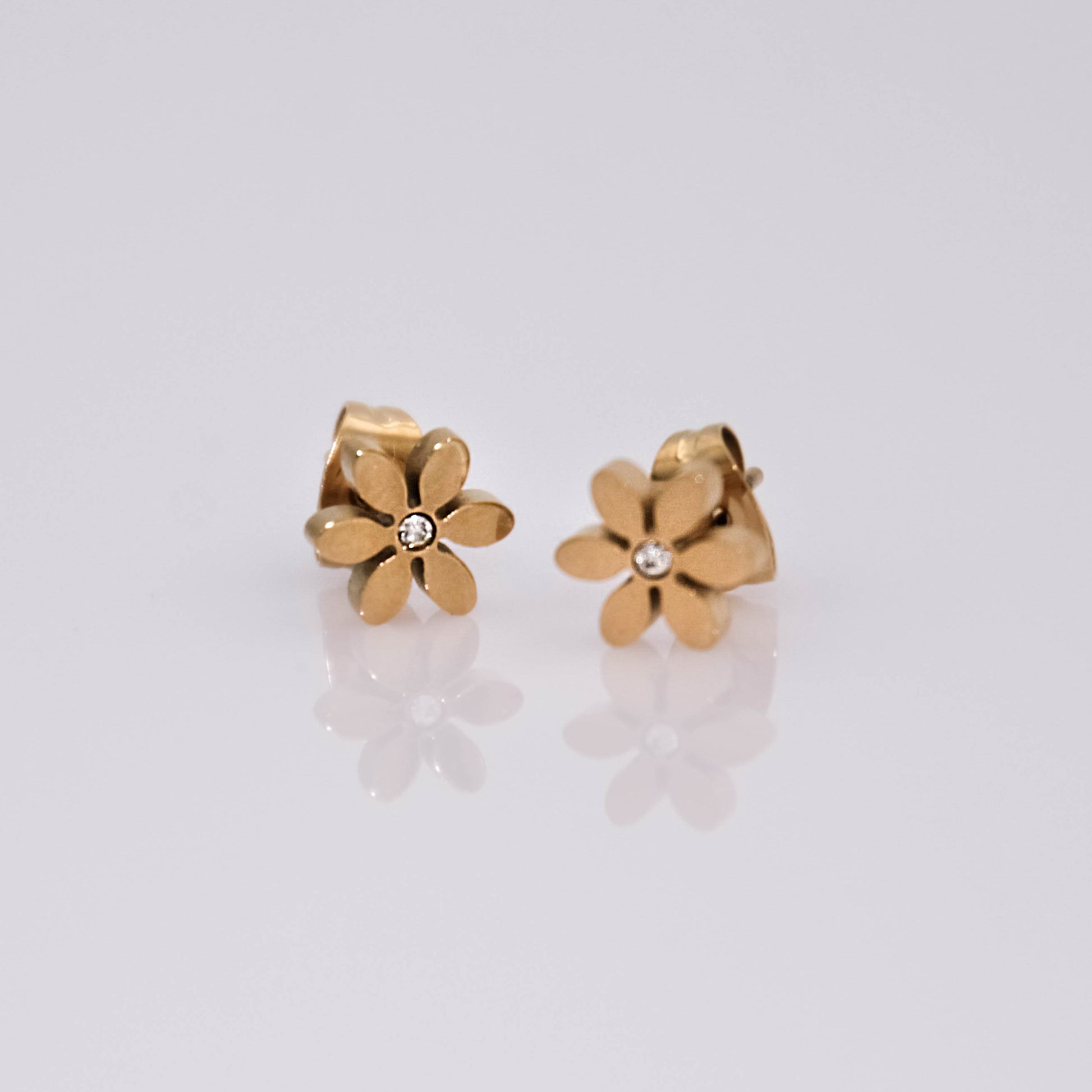 Arany színű, virág alakú, "beszúrós" típusú fülbevaló apró cirkónia kristállyal.