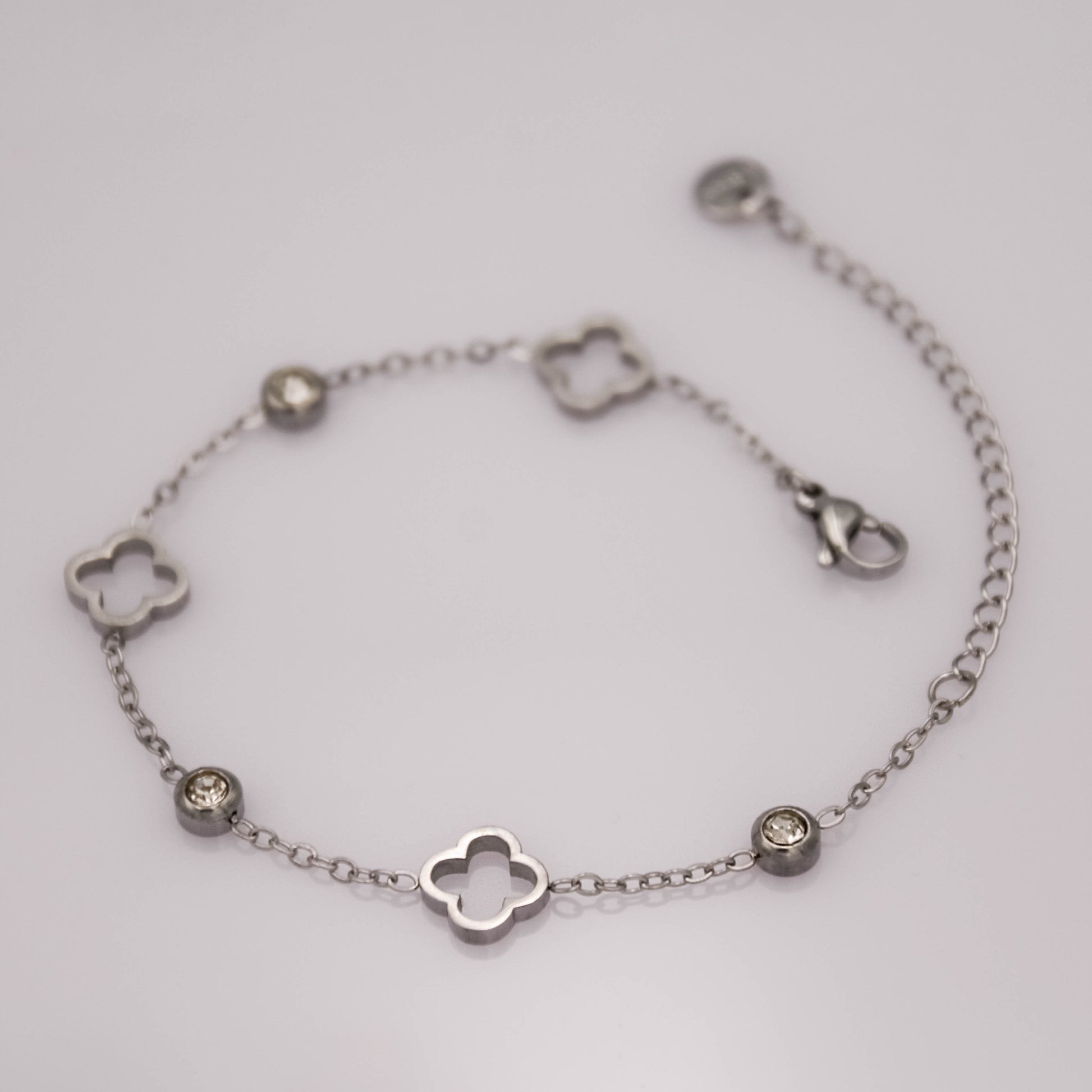 Ezüst színű karkötő cirkónia kristályos- és virág medálokkal.