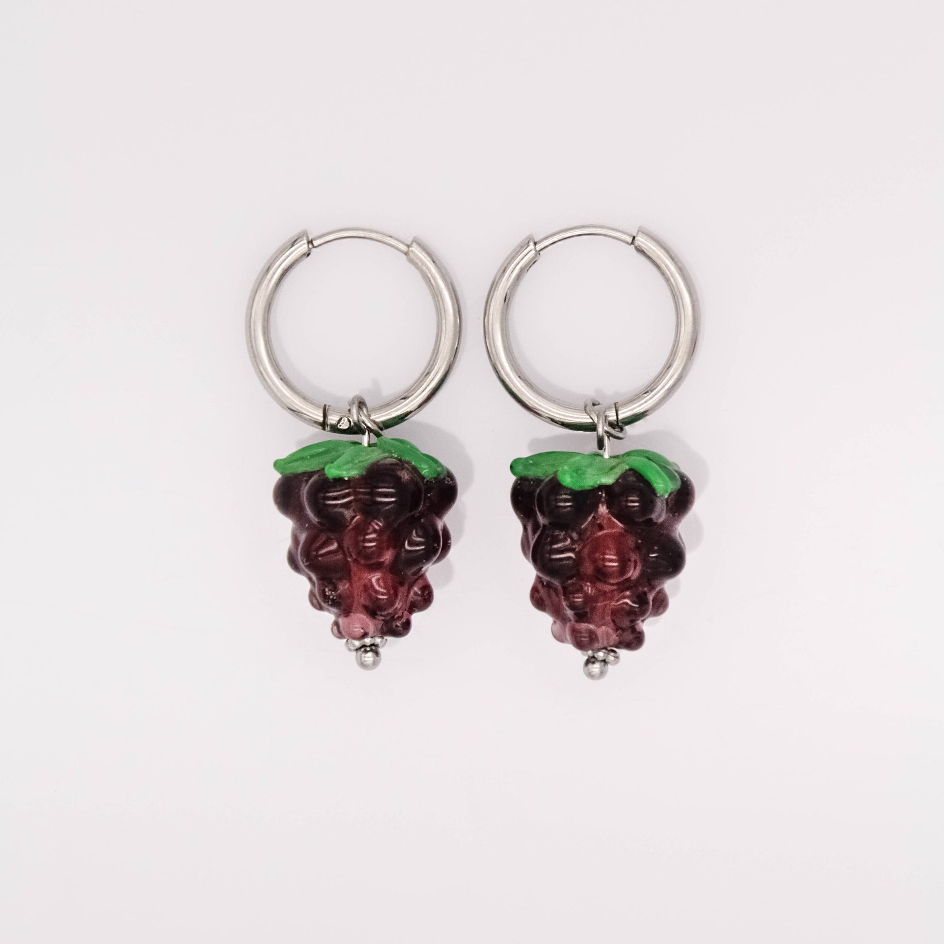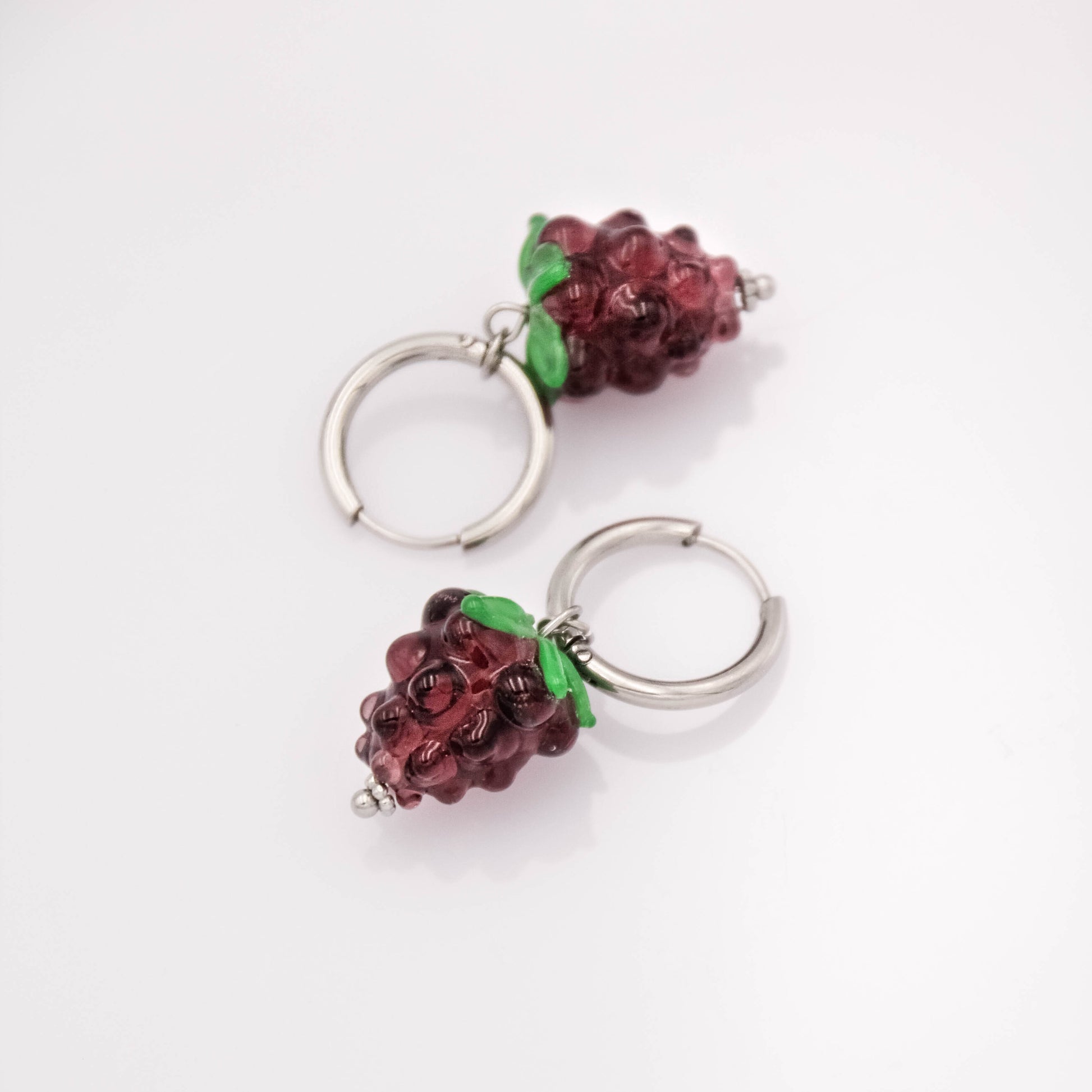 Ezüst színű fülbevaló üveggyöngy szederrel.