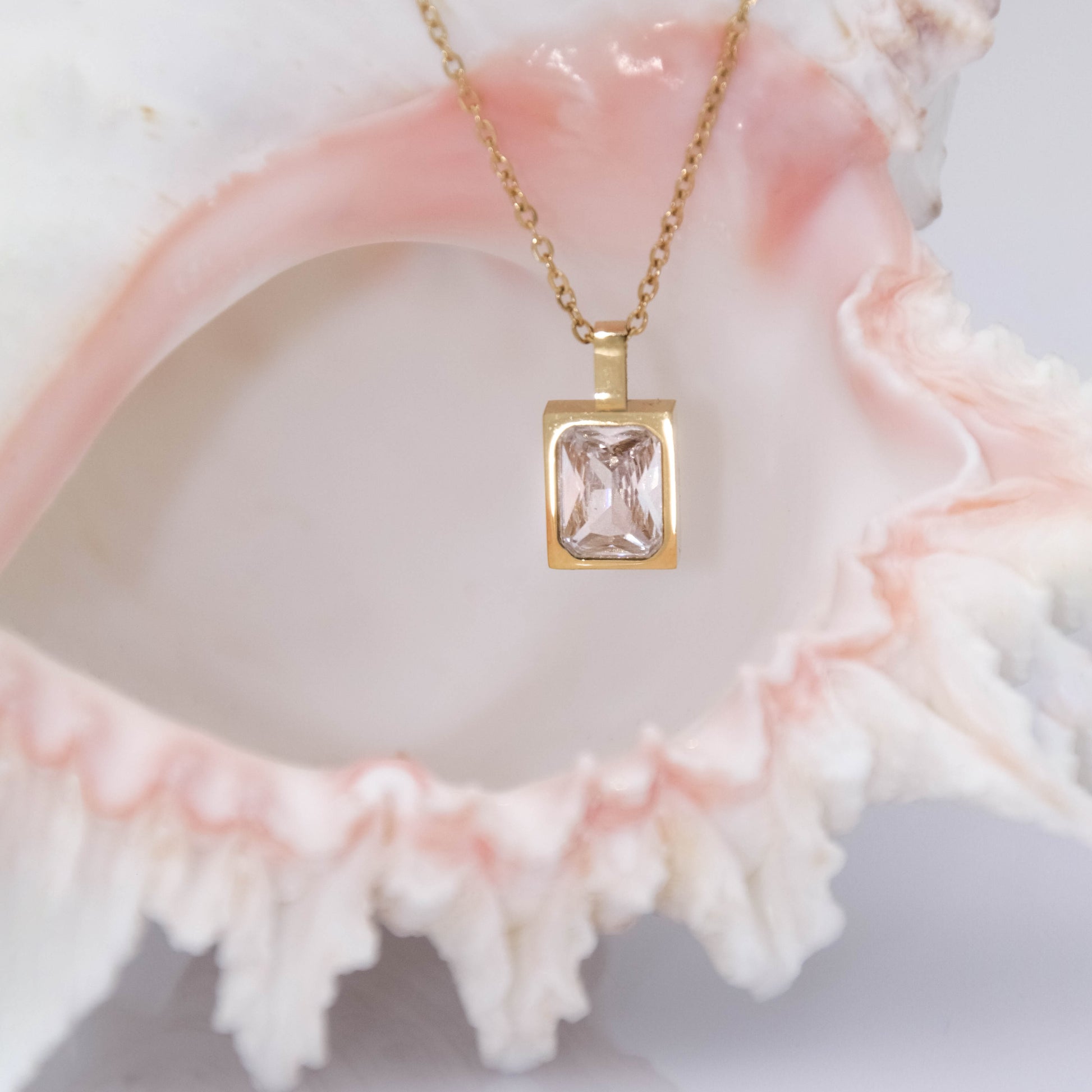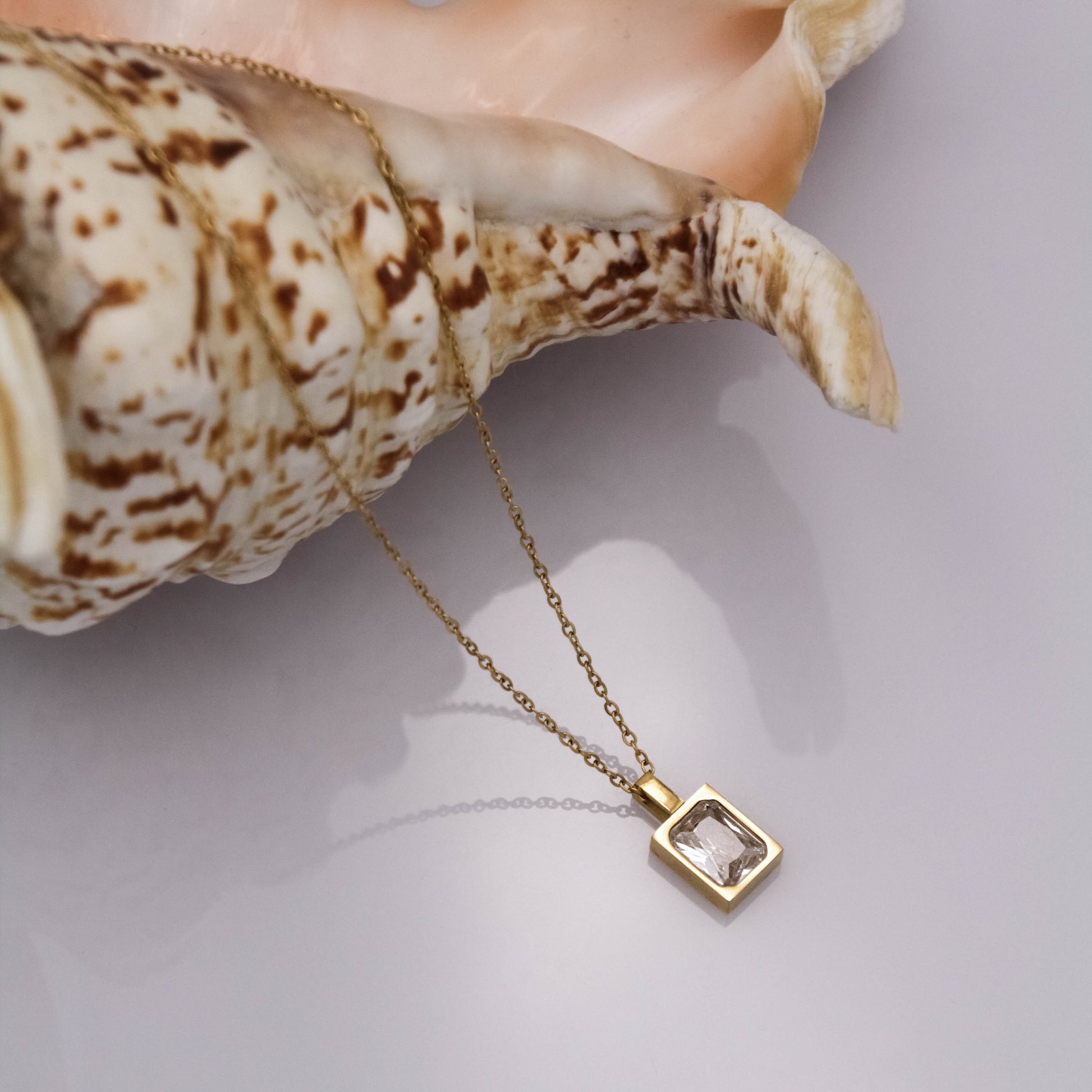 Arany színű nyaklánc téglalap alakú medállal, cirkónia kristály berakással.