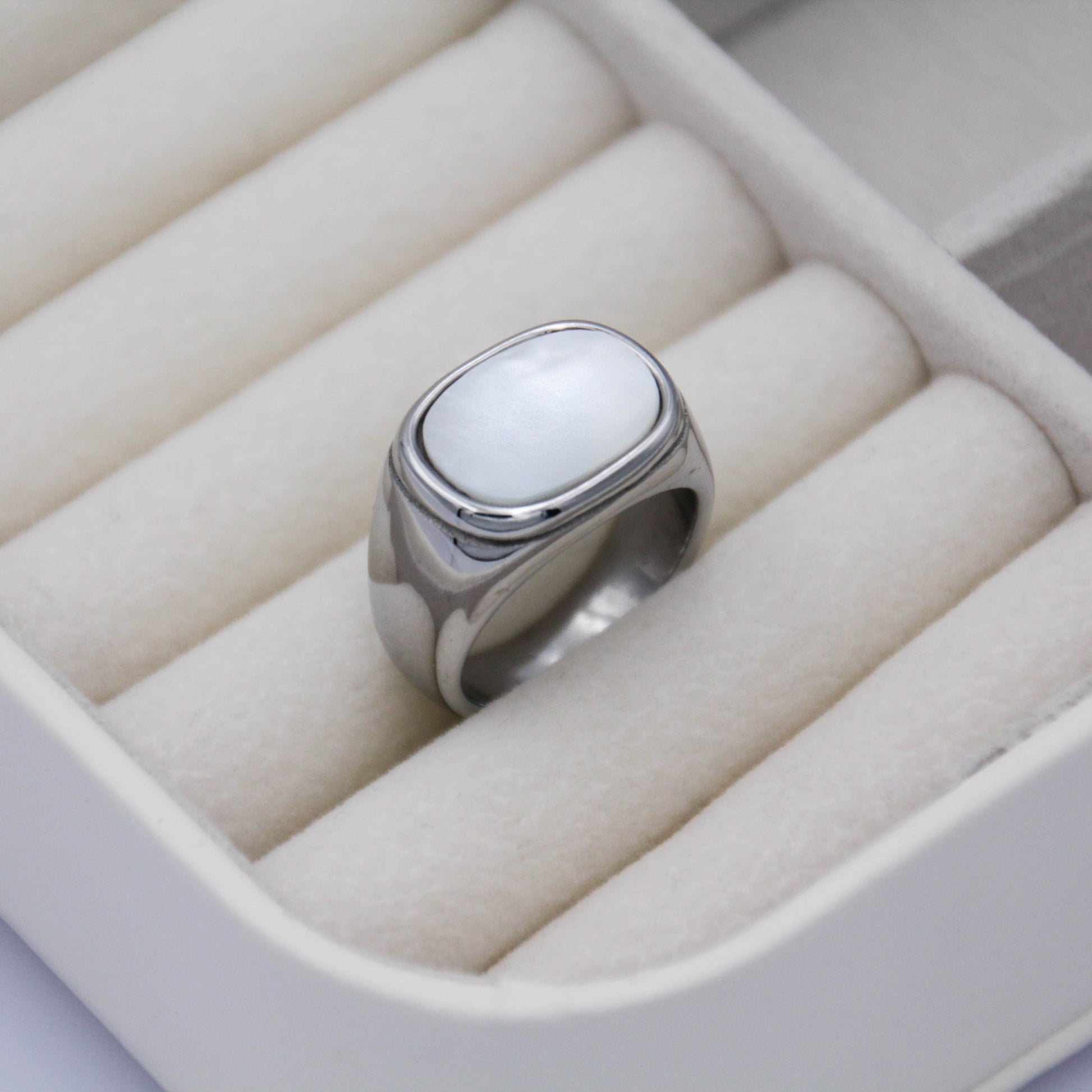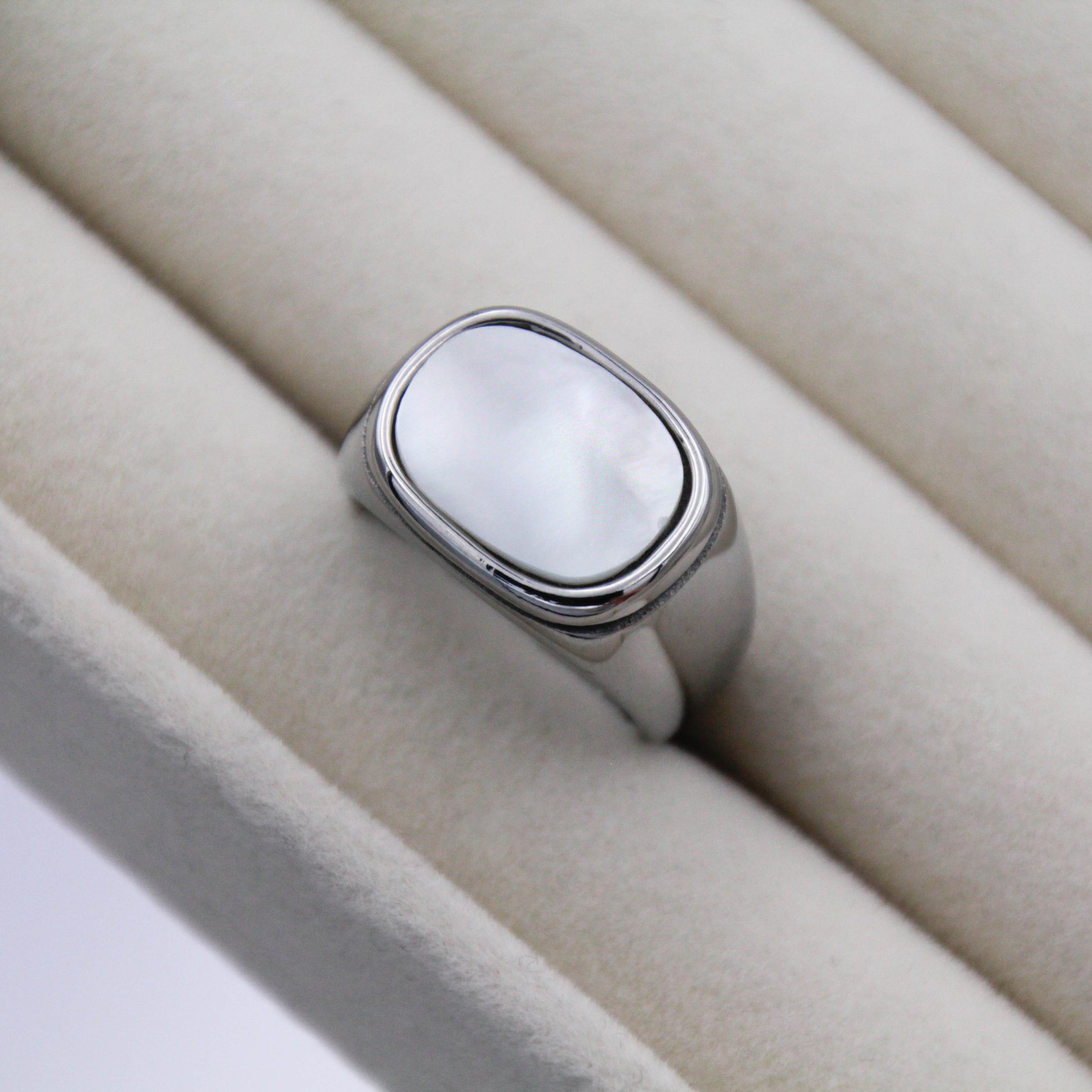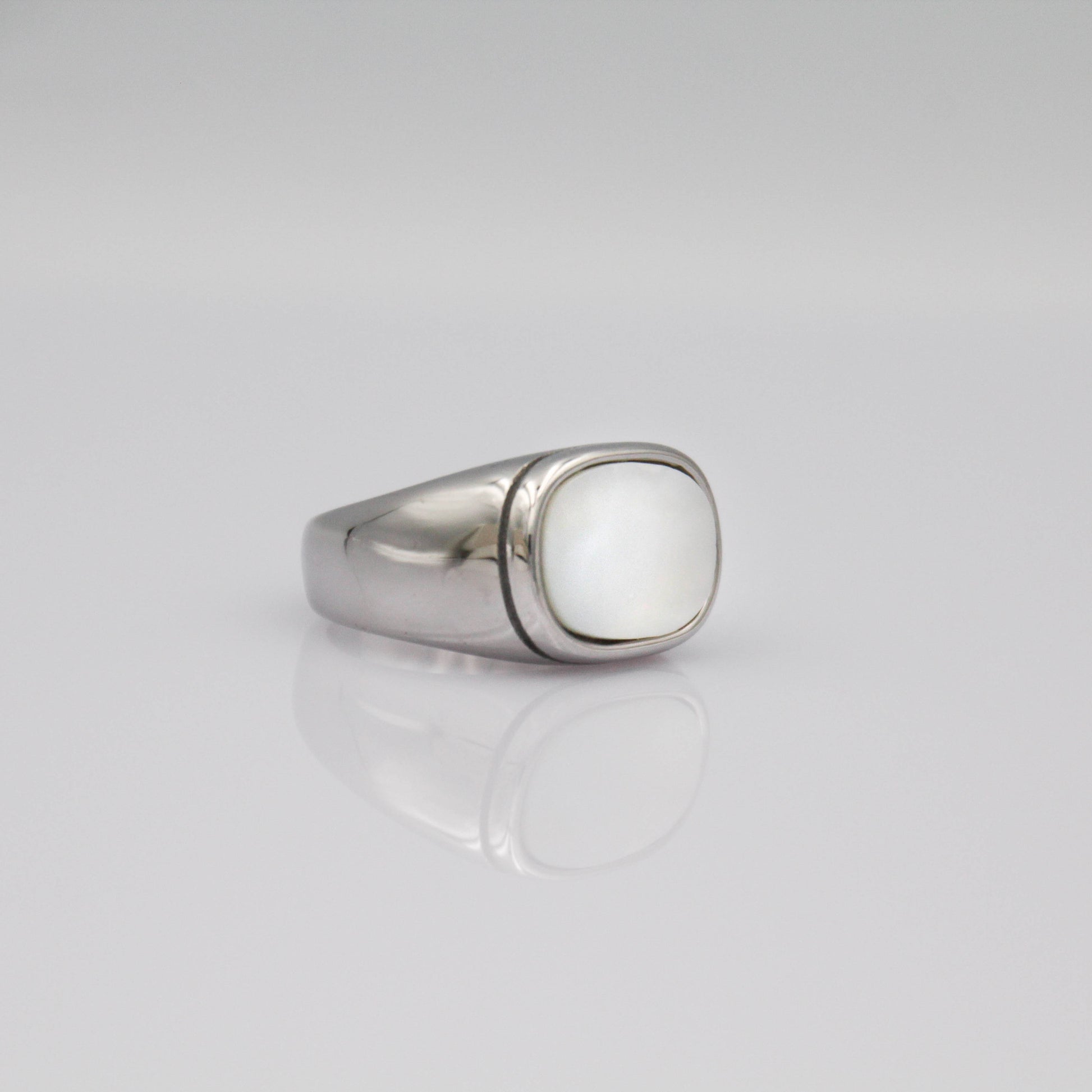 Ezüst színű gyűrű kagylóhéj berakással.