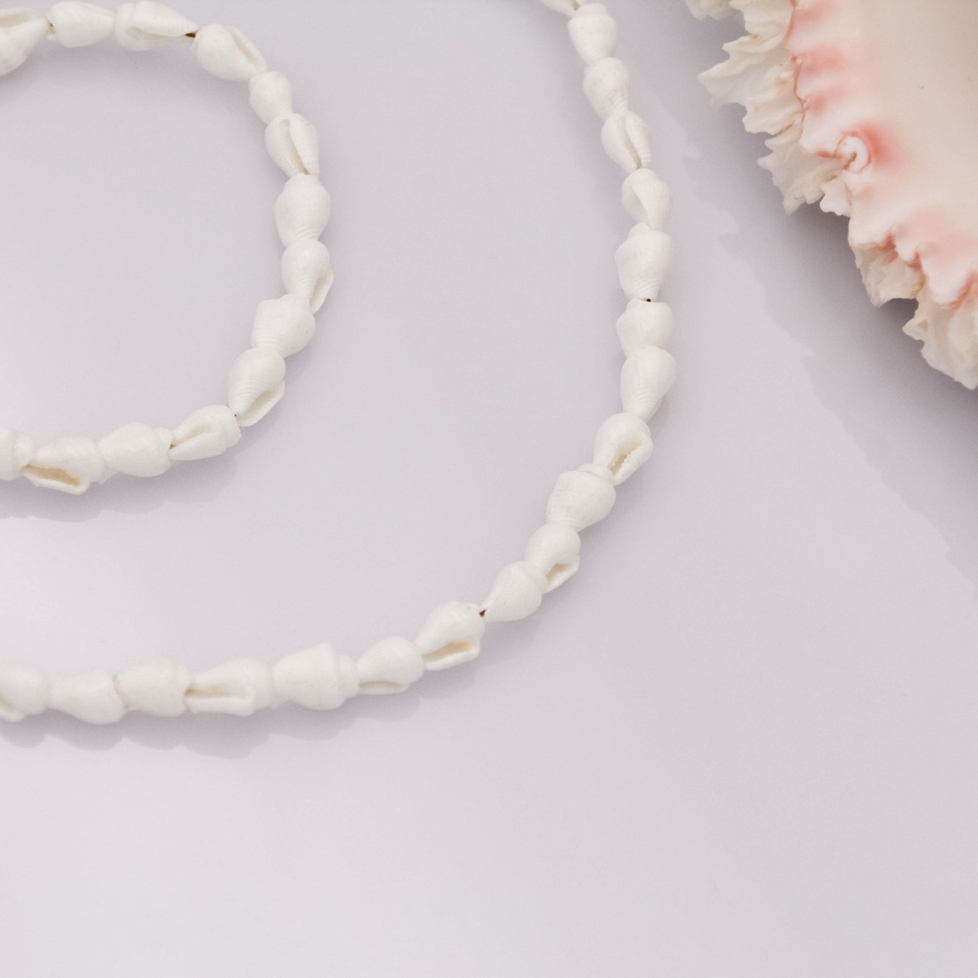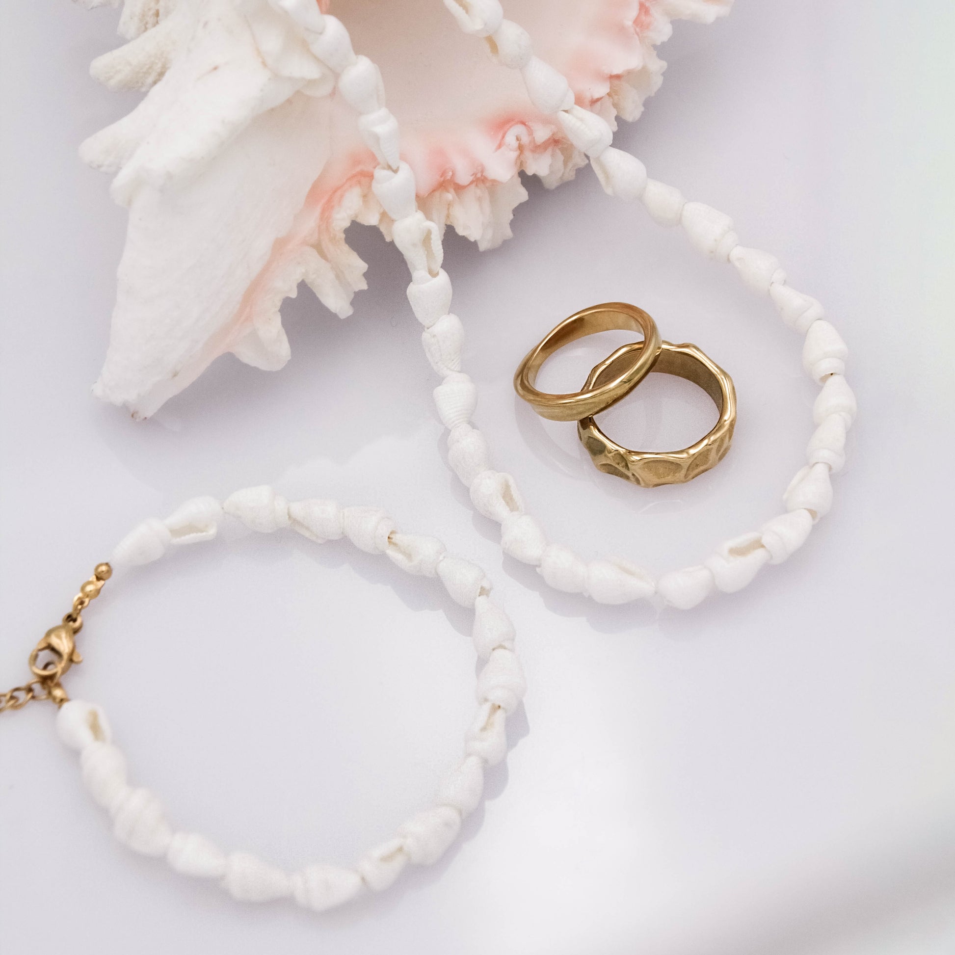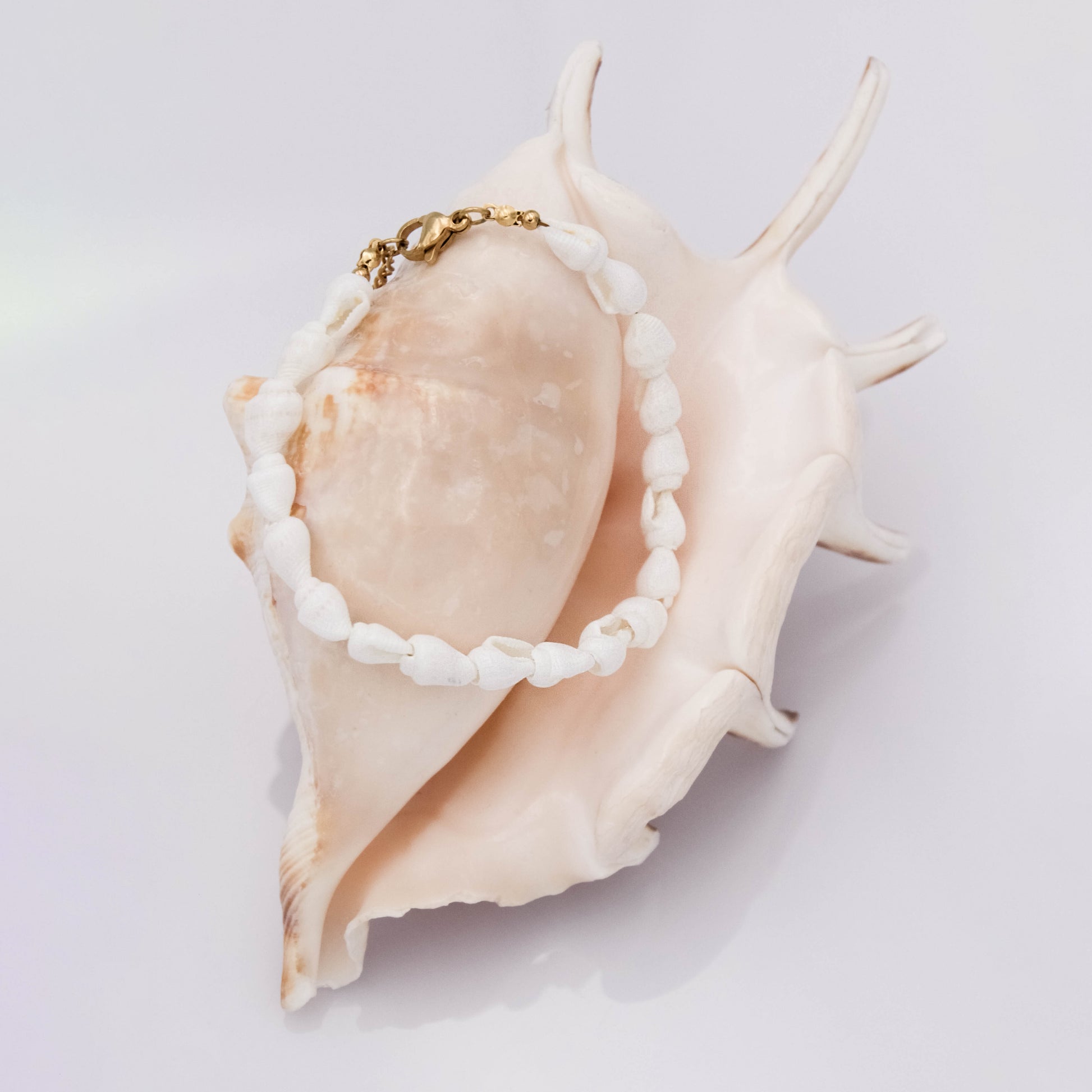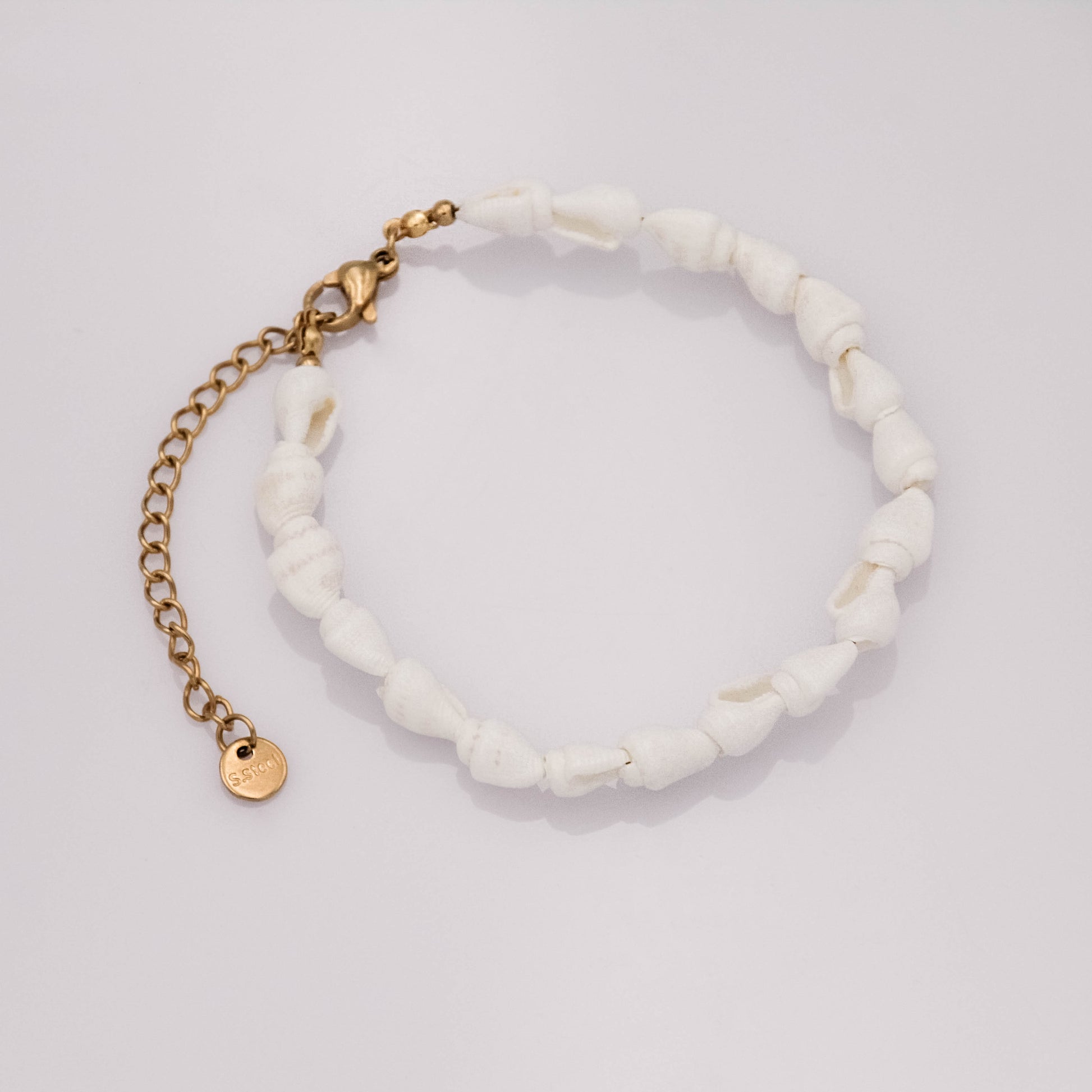 Arany színű csatokkal és hosszabbítóval ellátott, fehér csigakagylókból álló karkötő.