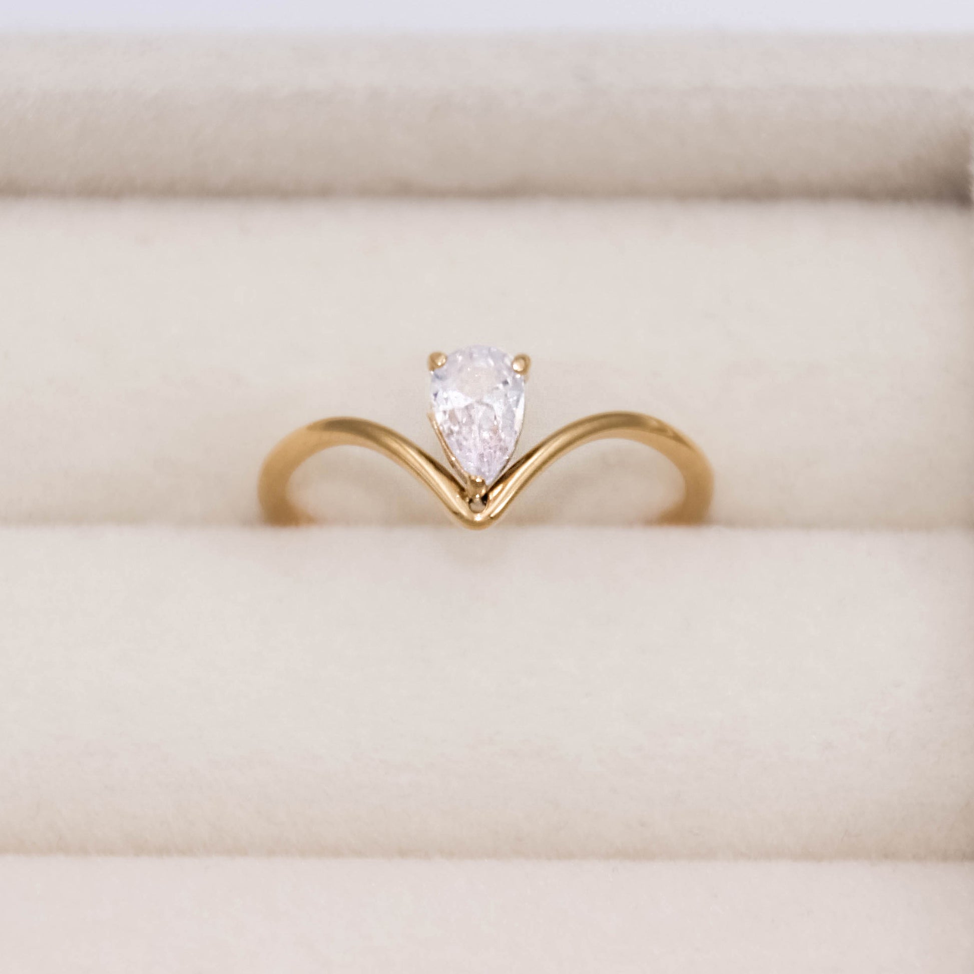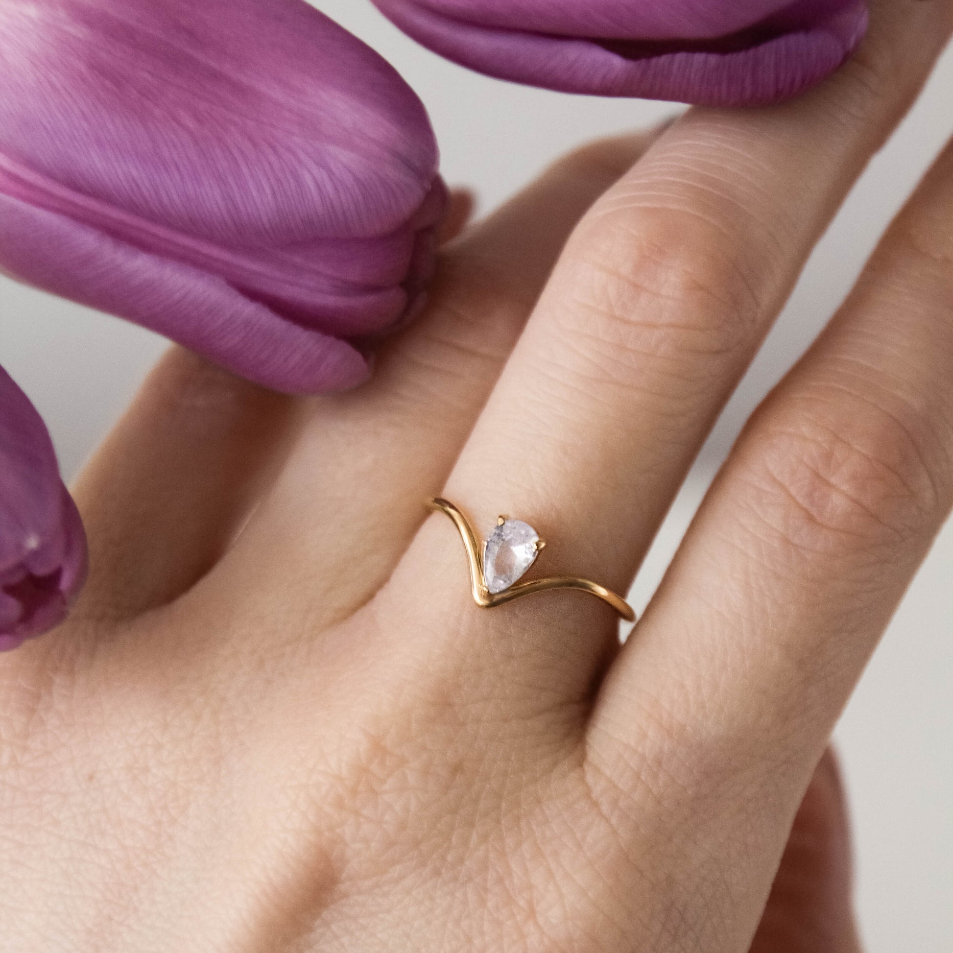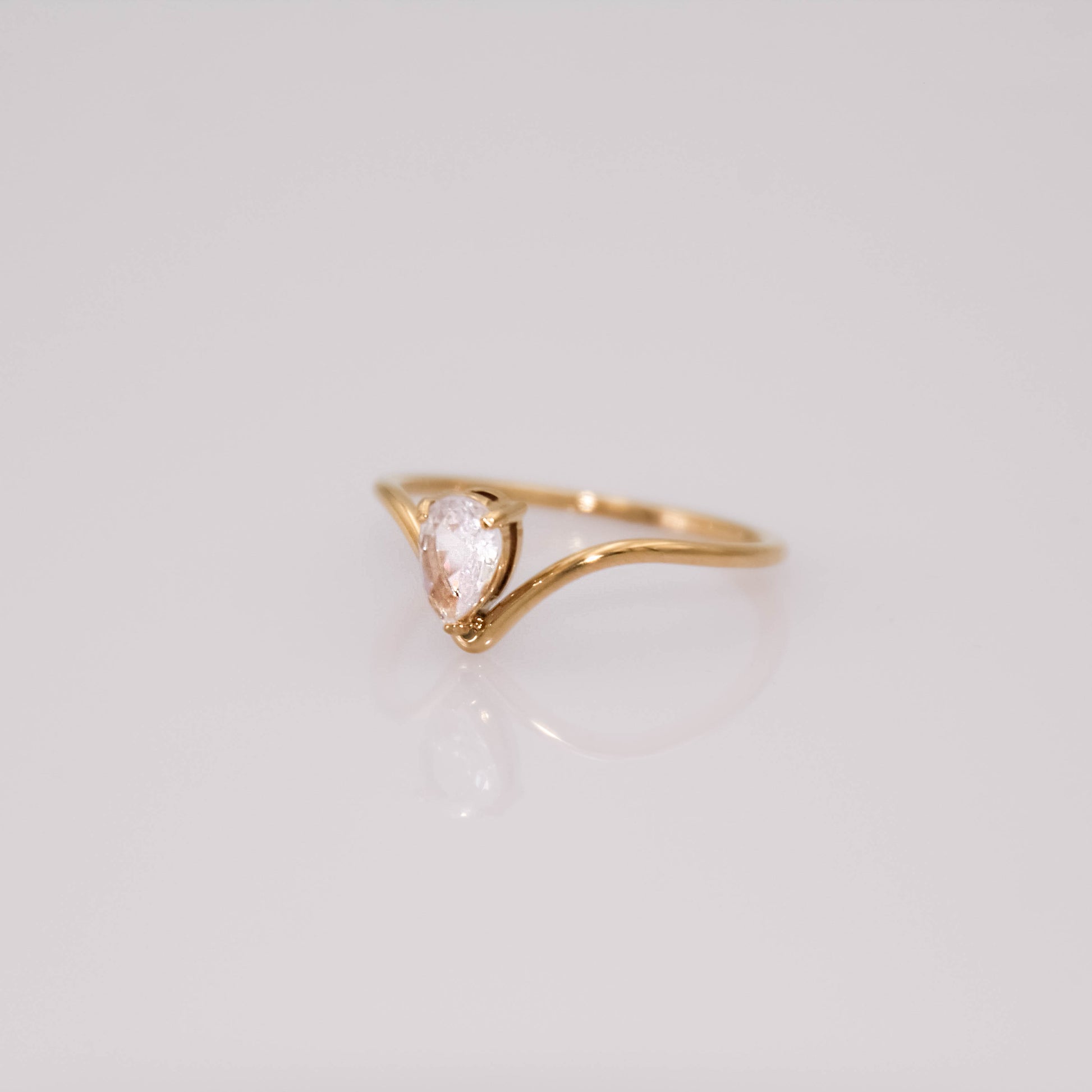 Arany színű, ívelt formájú, vékony gyűrű csepp alakú cirkónia kristállyal.