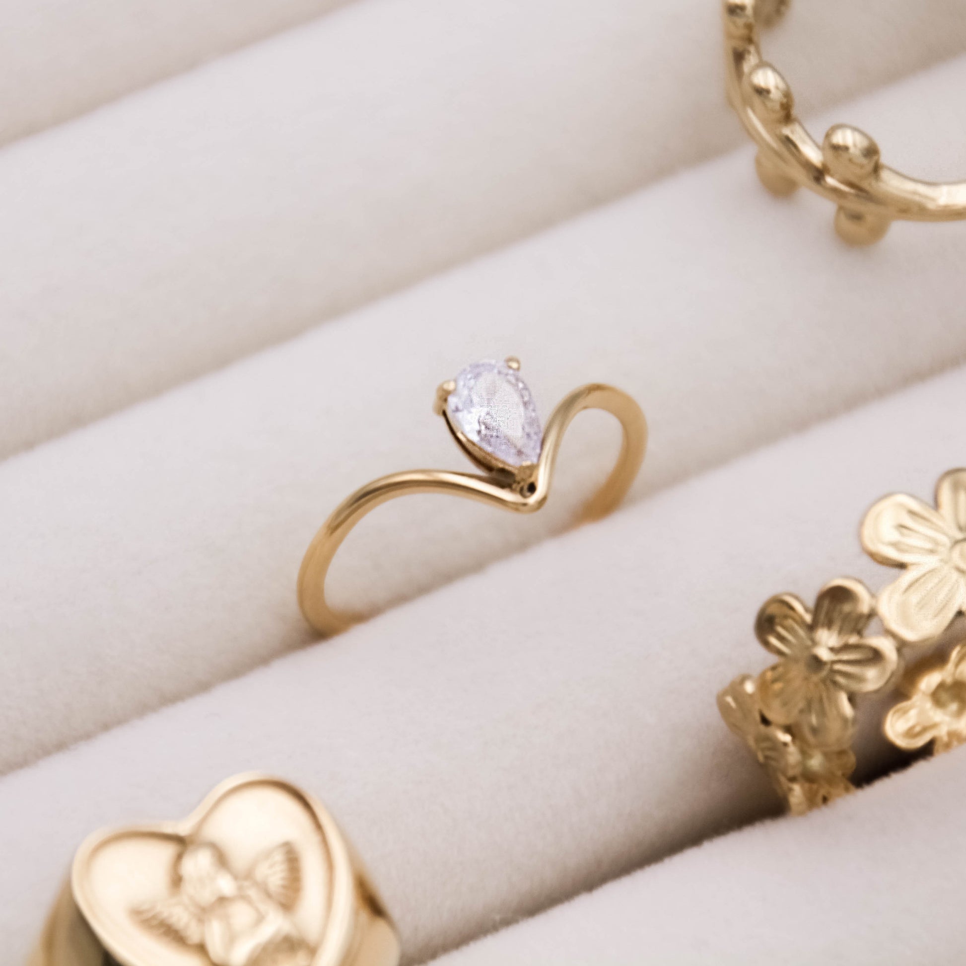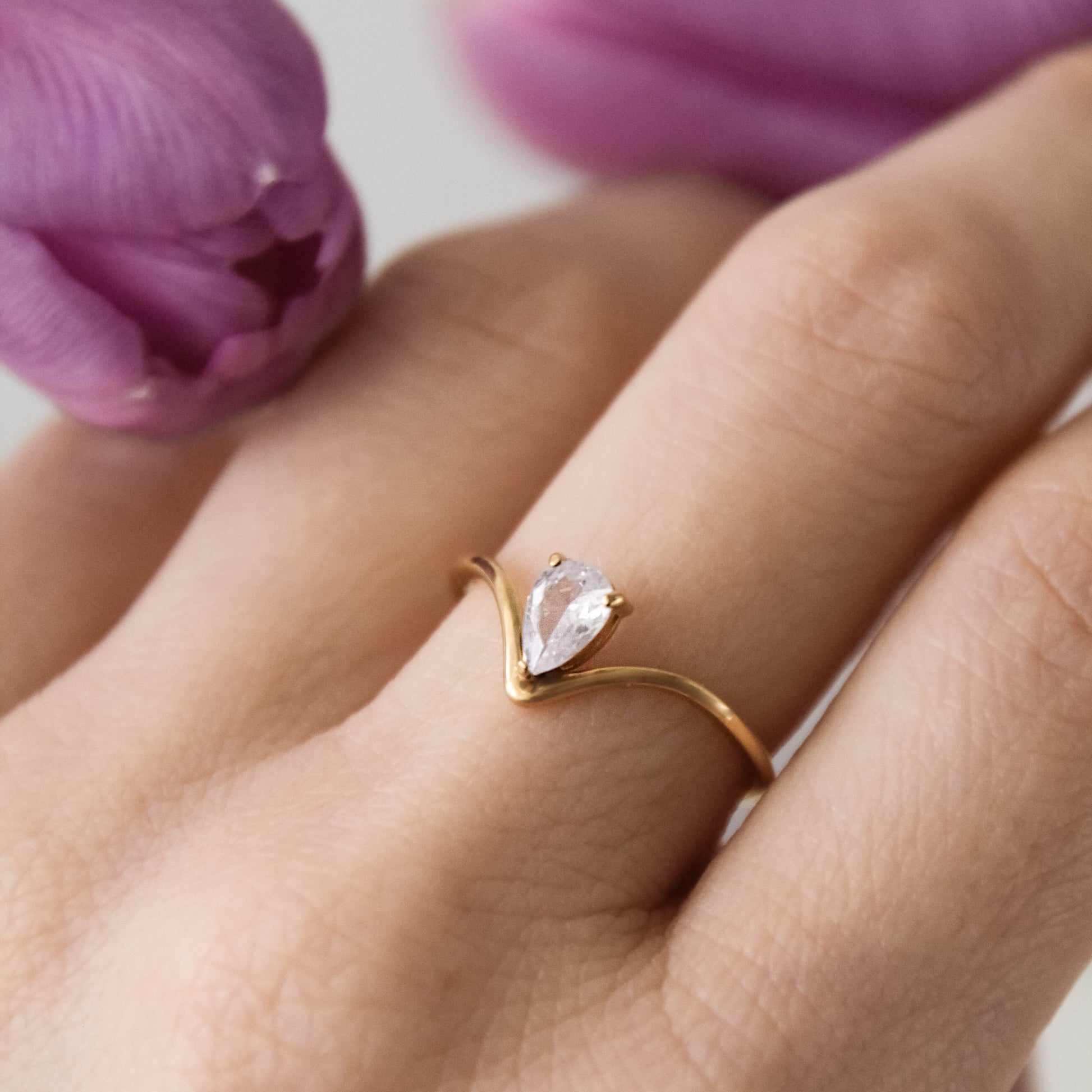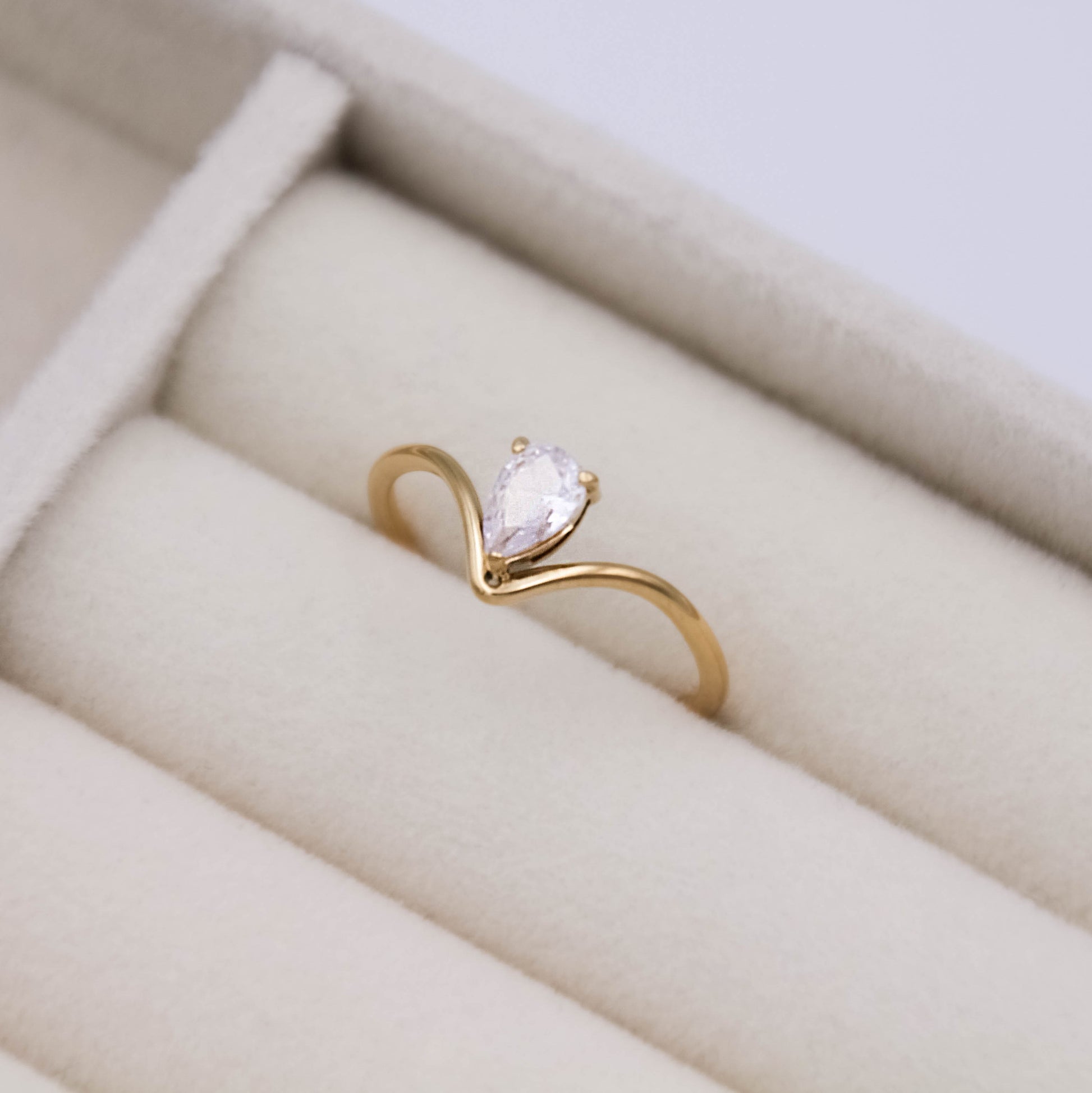 Arany színű, ívelt formájú, vékony gyűrű csepp alakú cirkónia kristállyal.