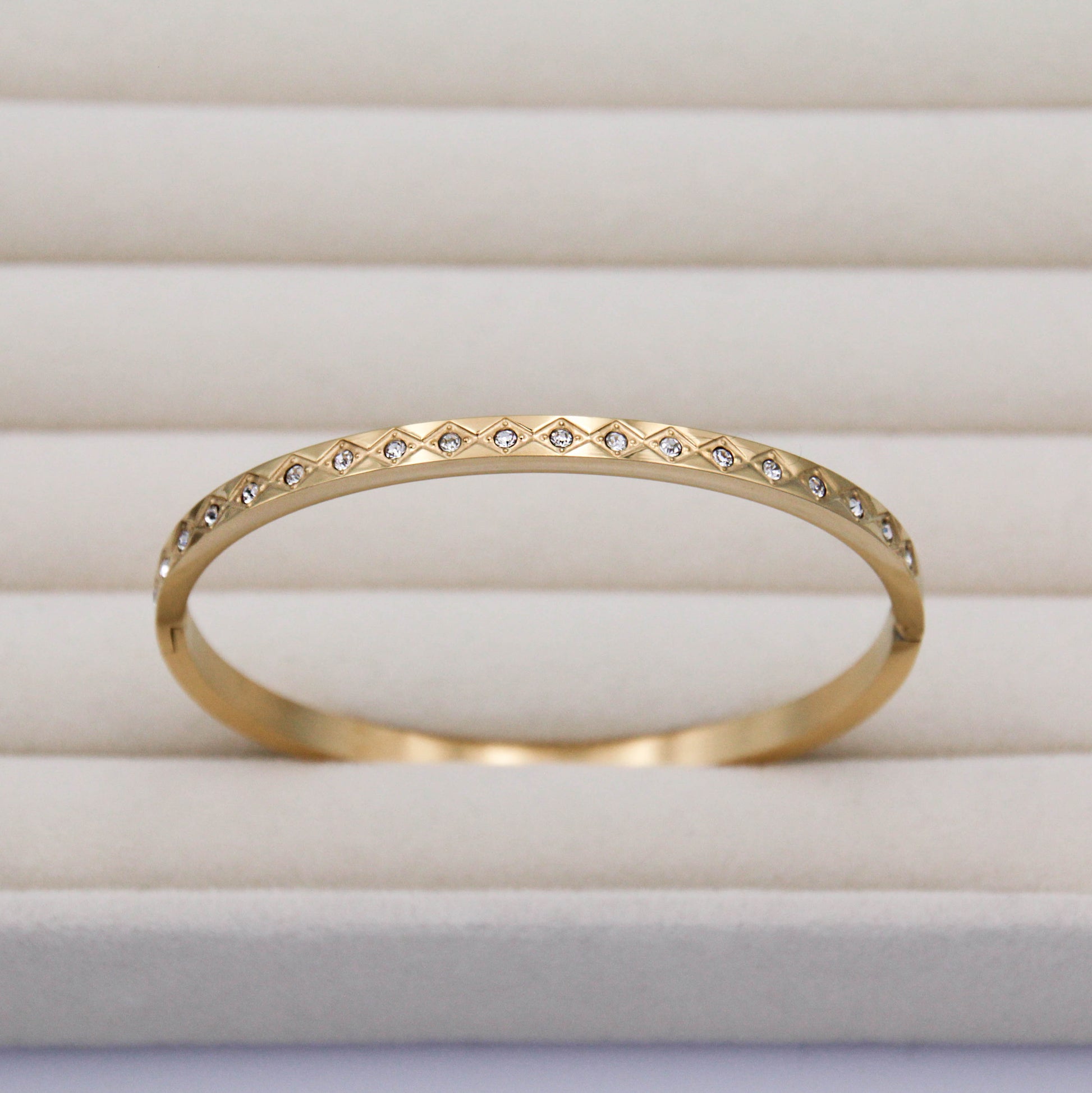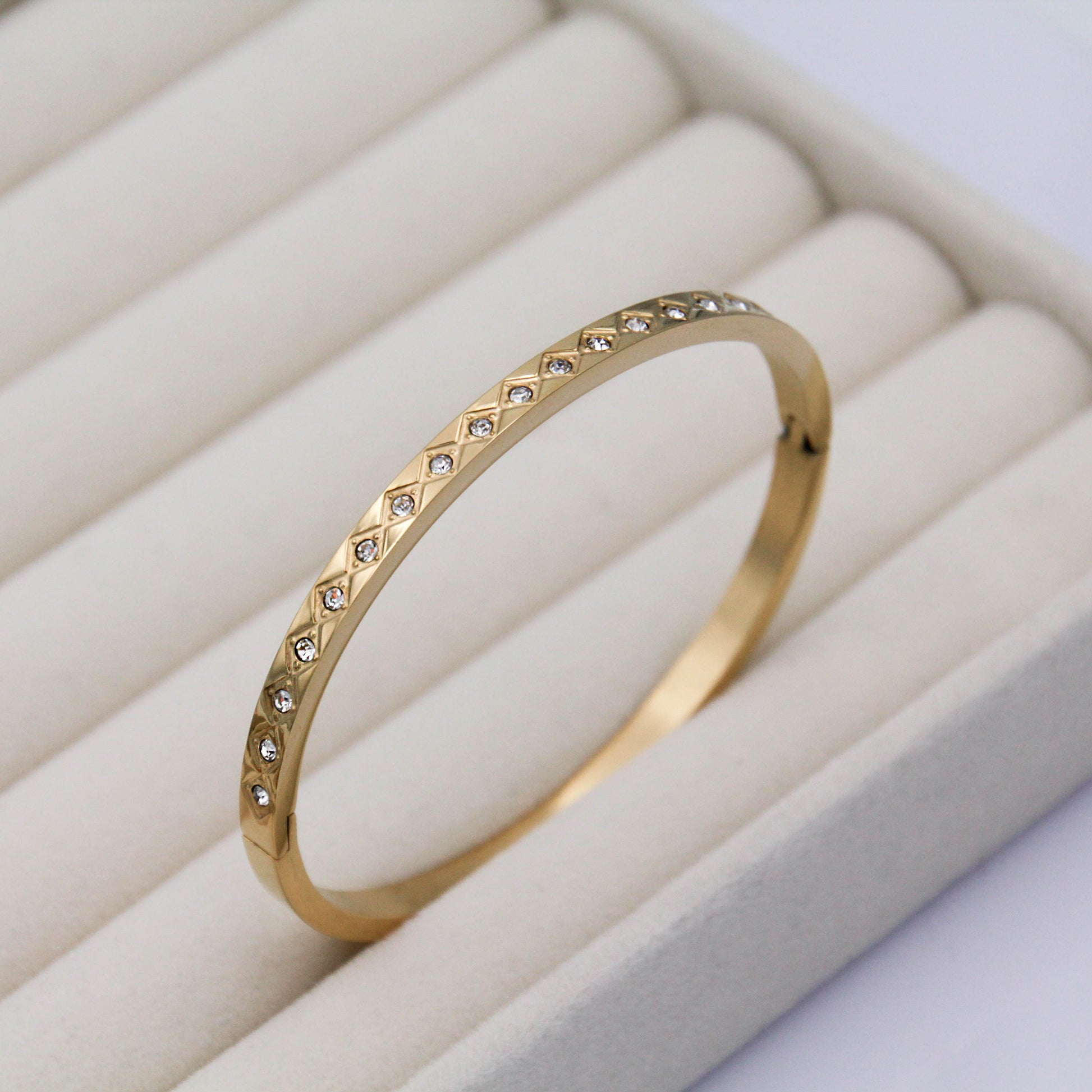 Arany színű karkötő cirkónia kristályokkal.