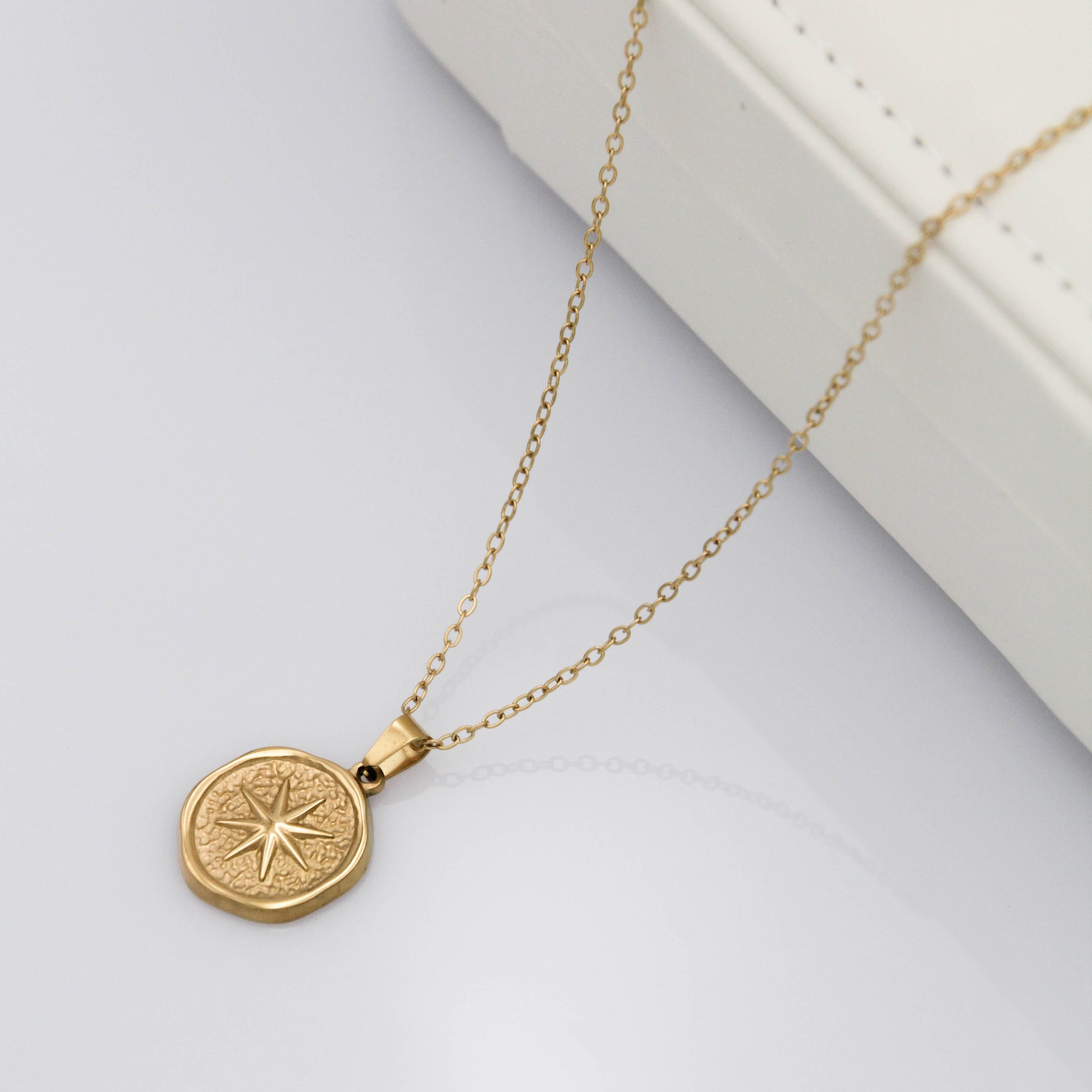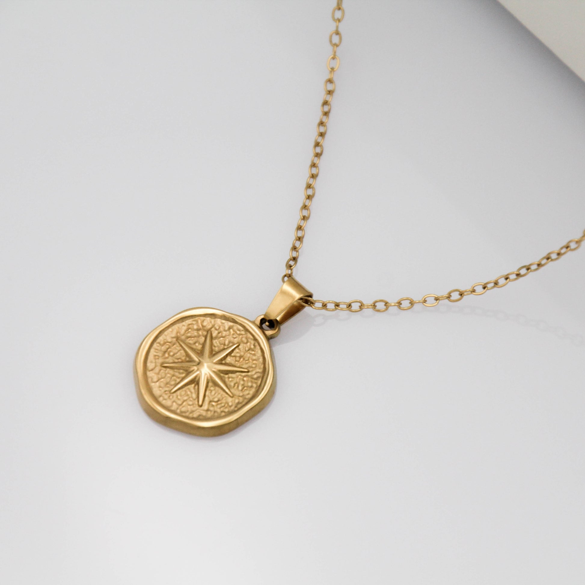 Arany színű nyaklánc kör alakú medállal, csillag gravírozással.