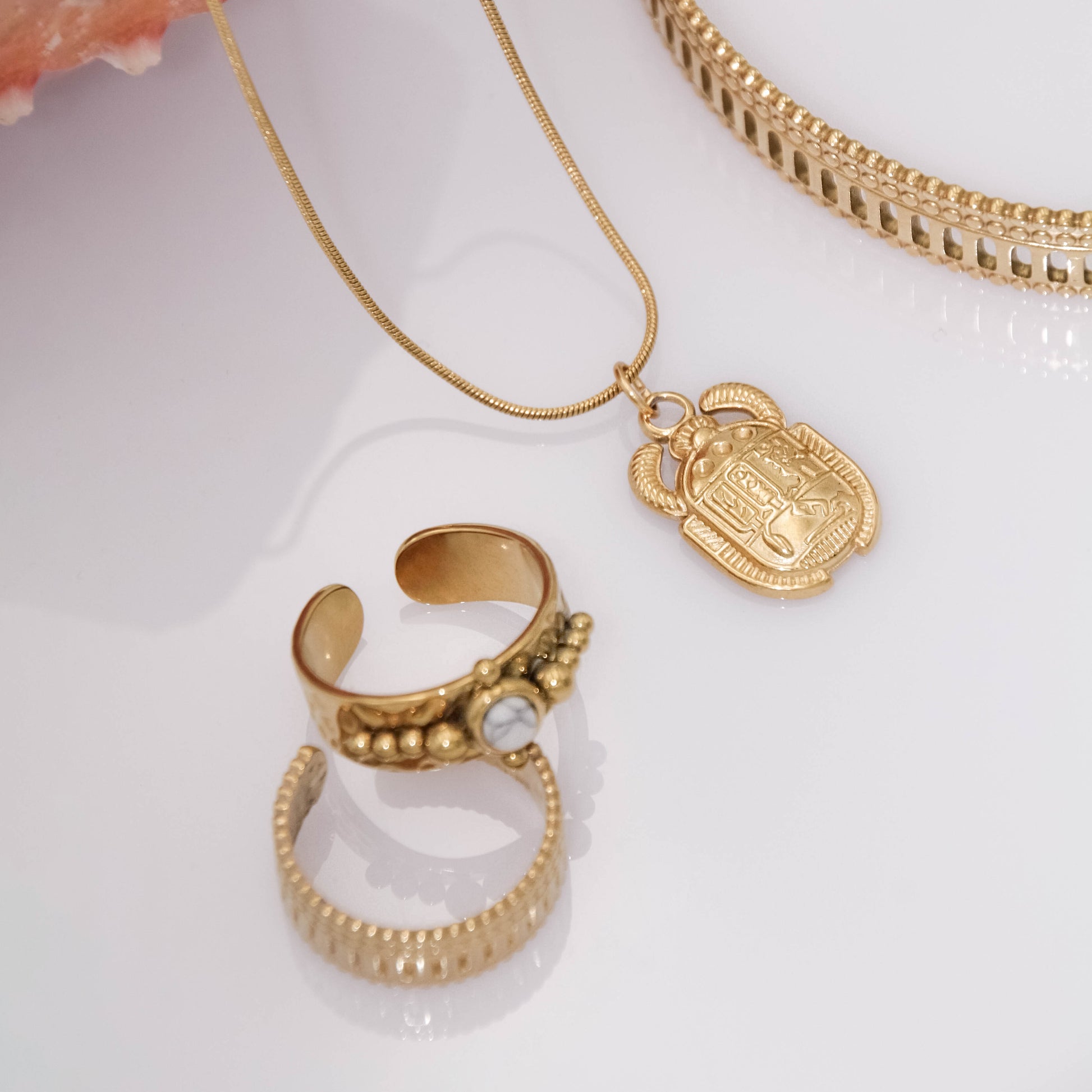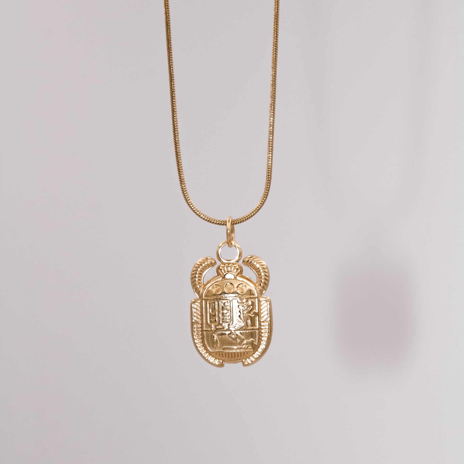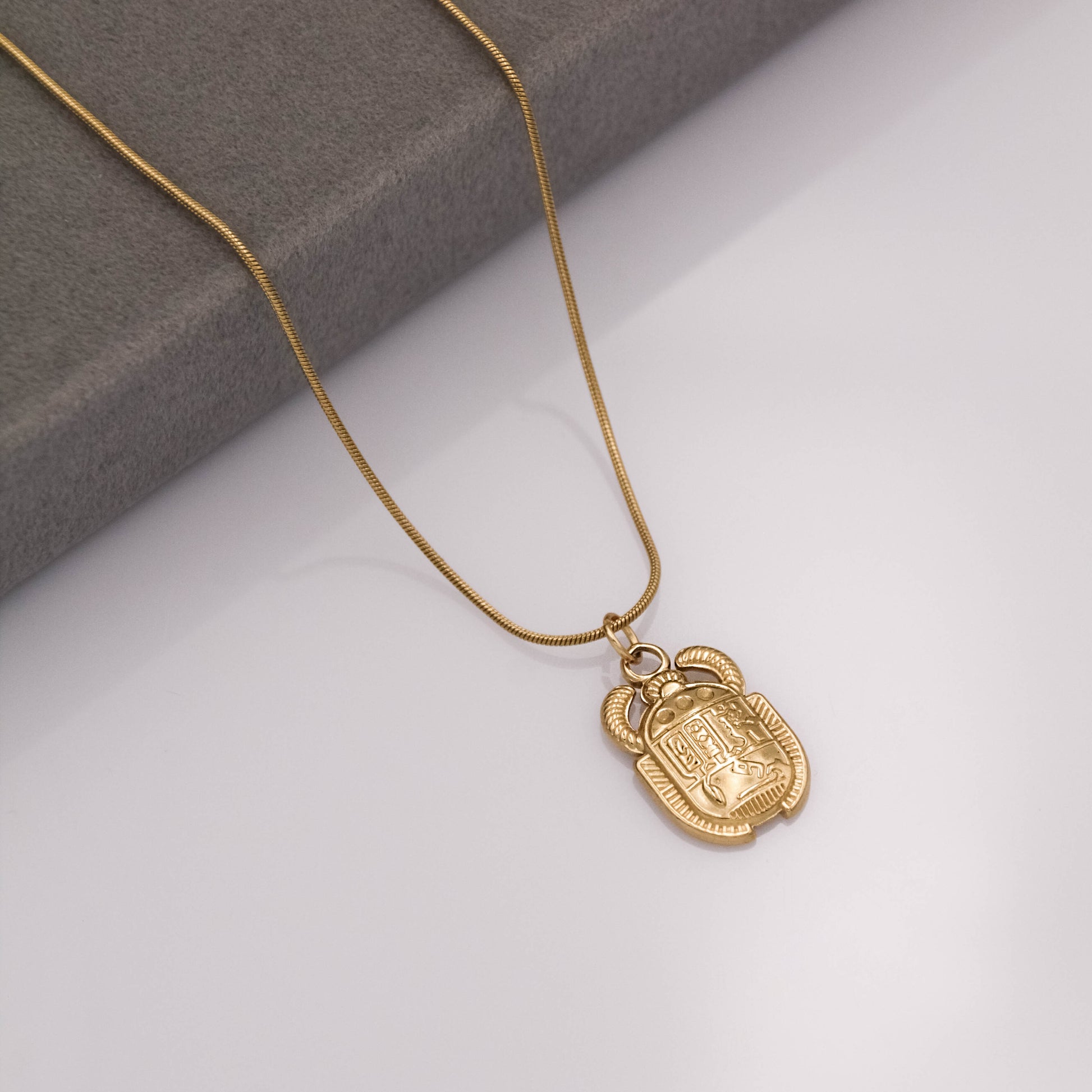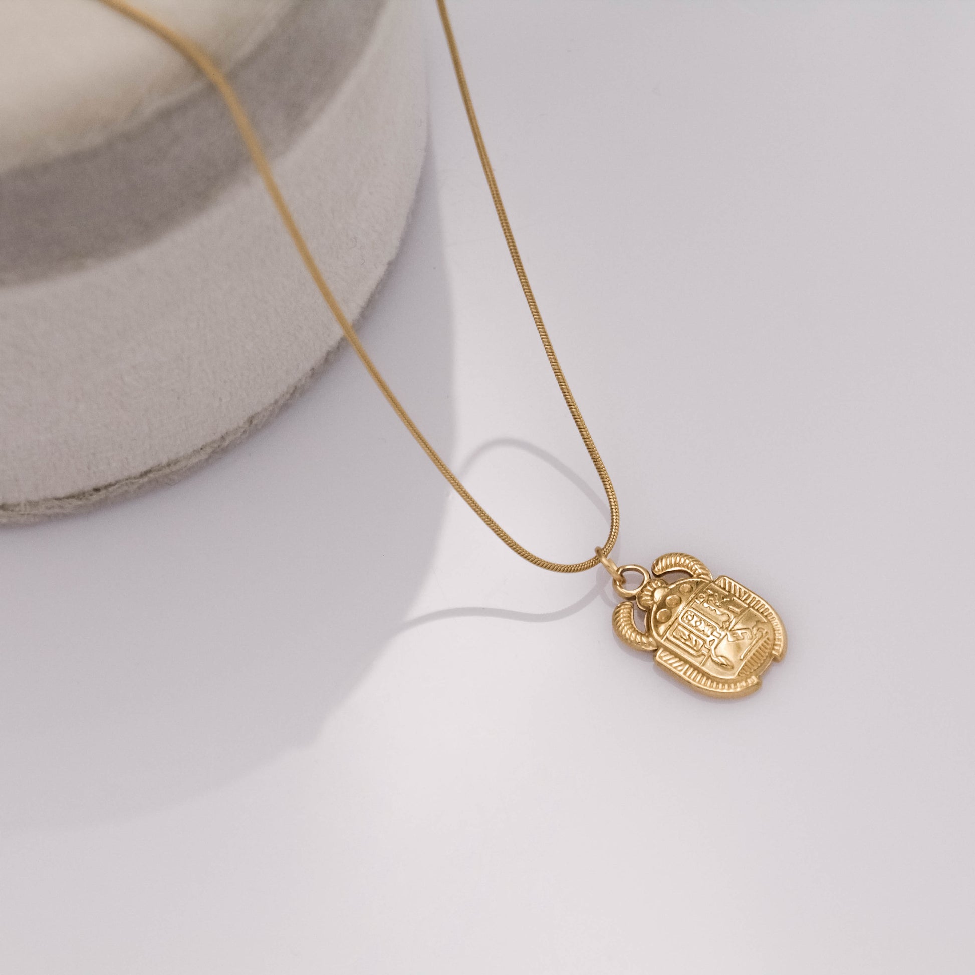 Arany színű nyaklánc szkarabeusz alakú medállal.