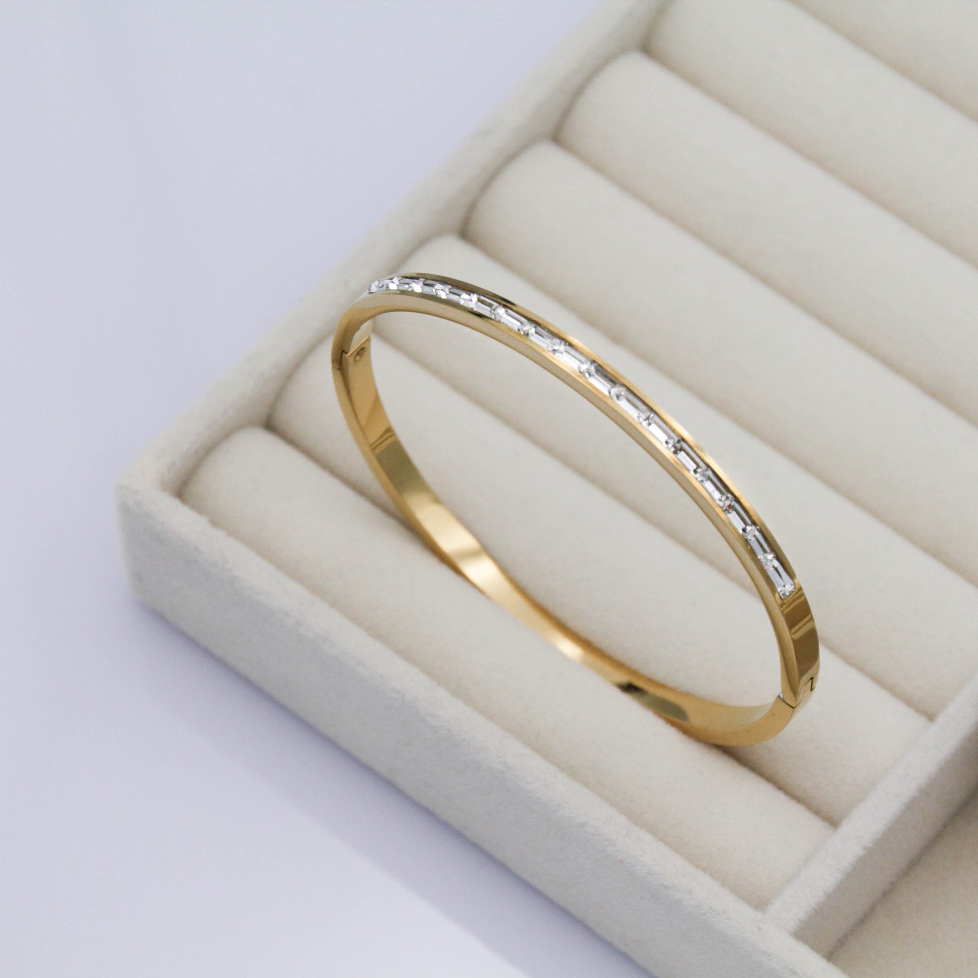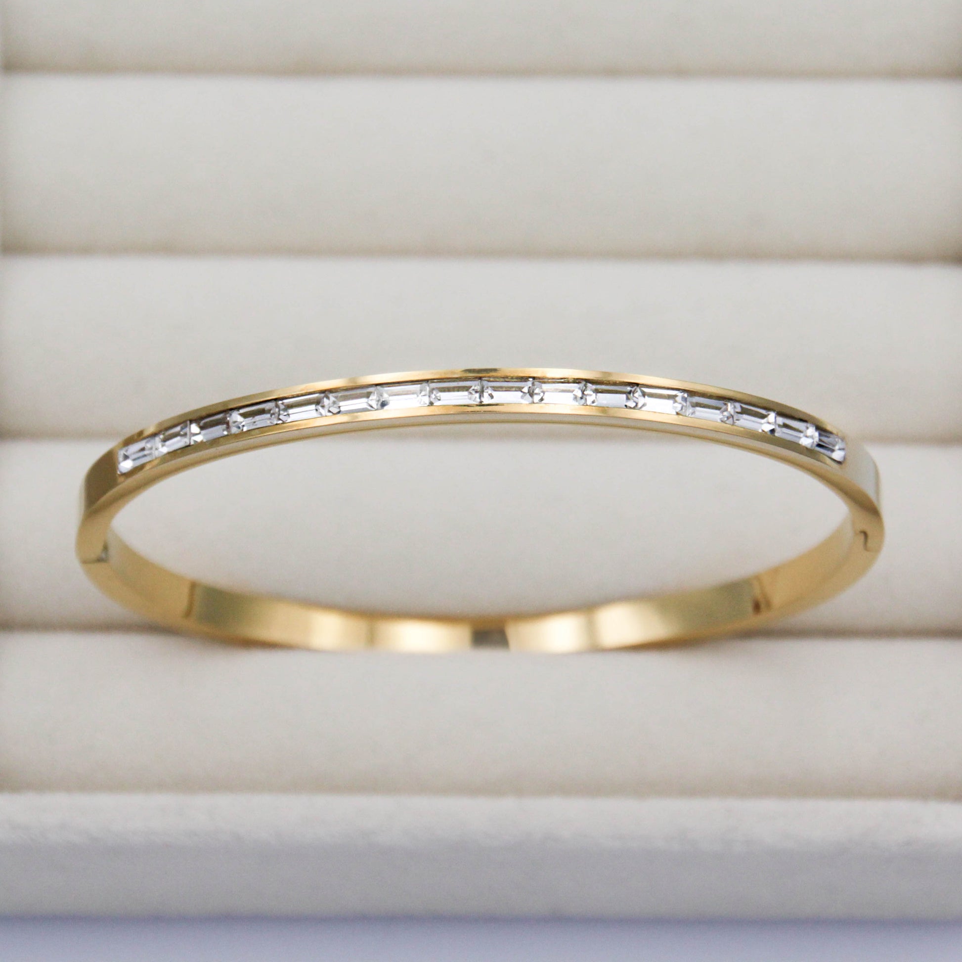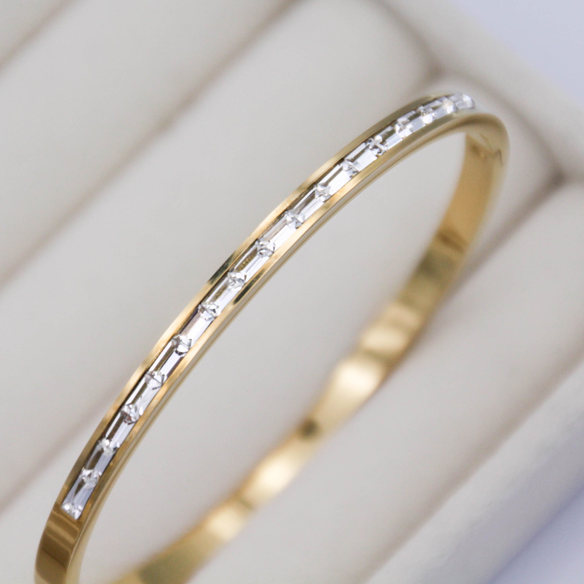 Arany színű karkötő cirkónia kristályokkal.
