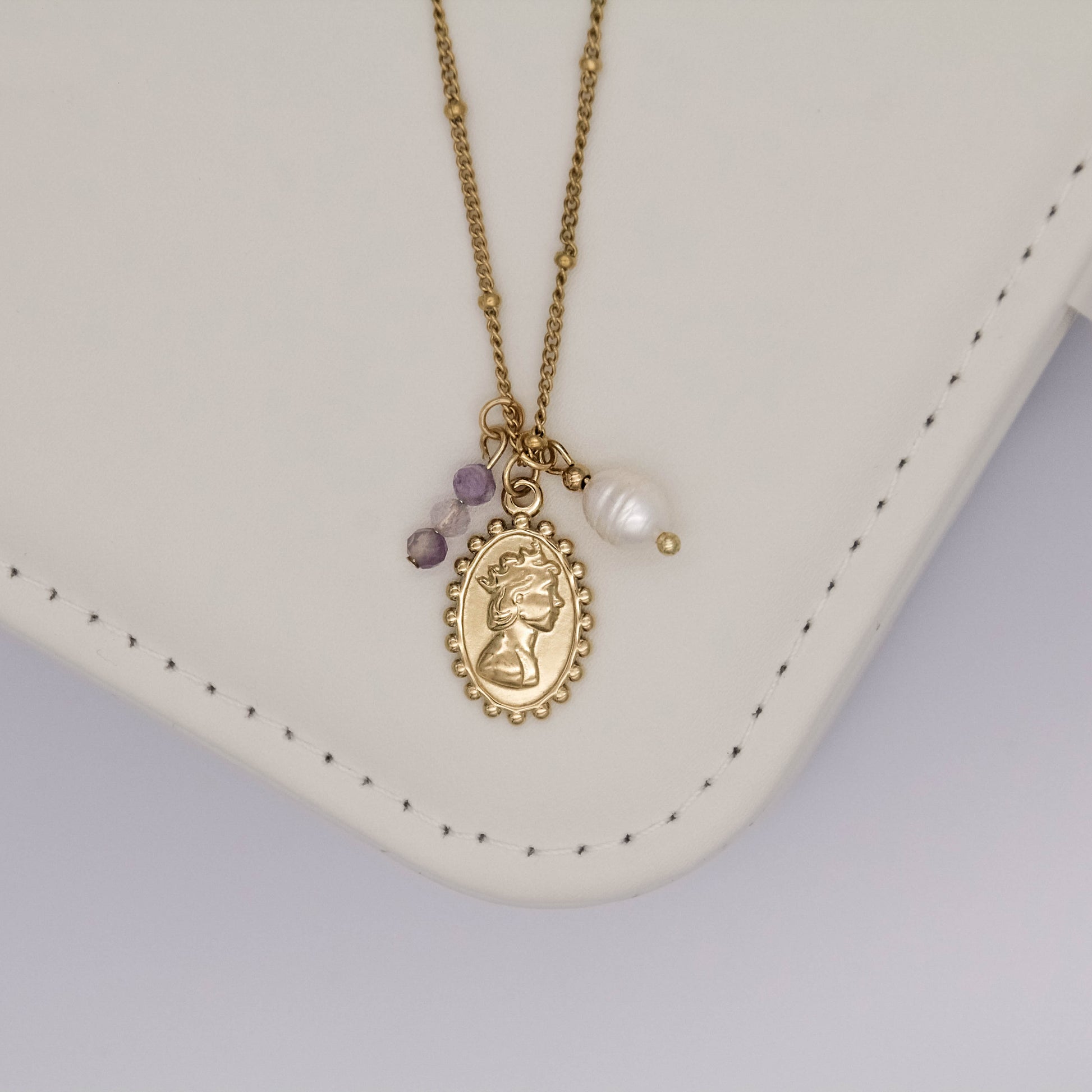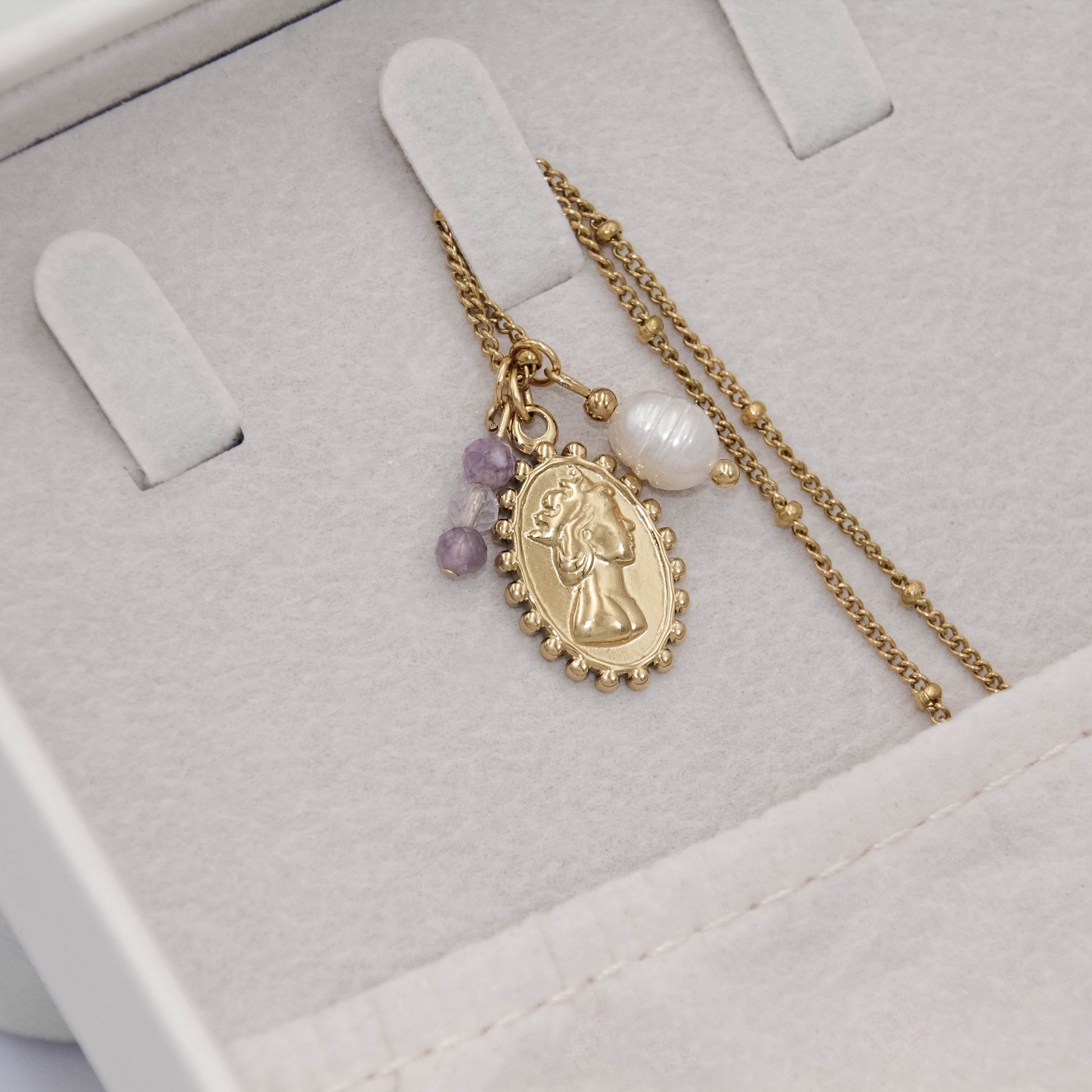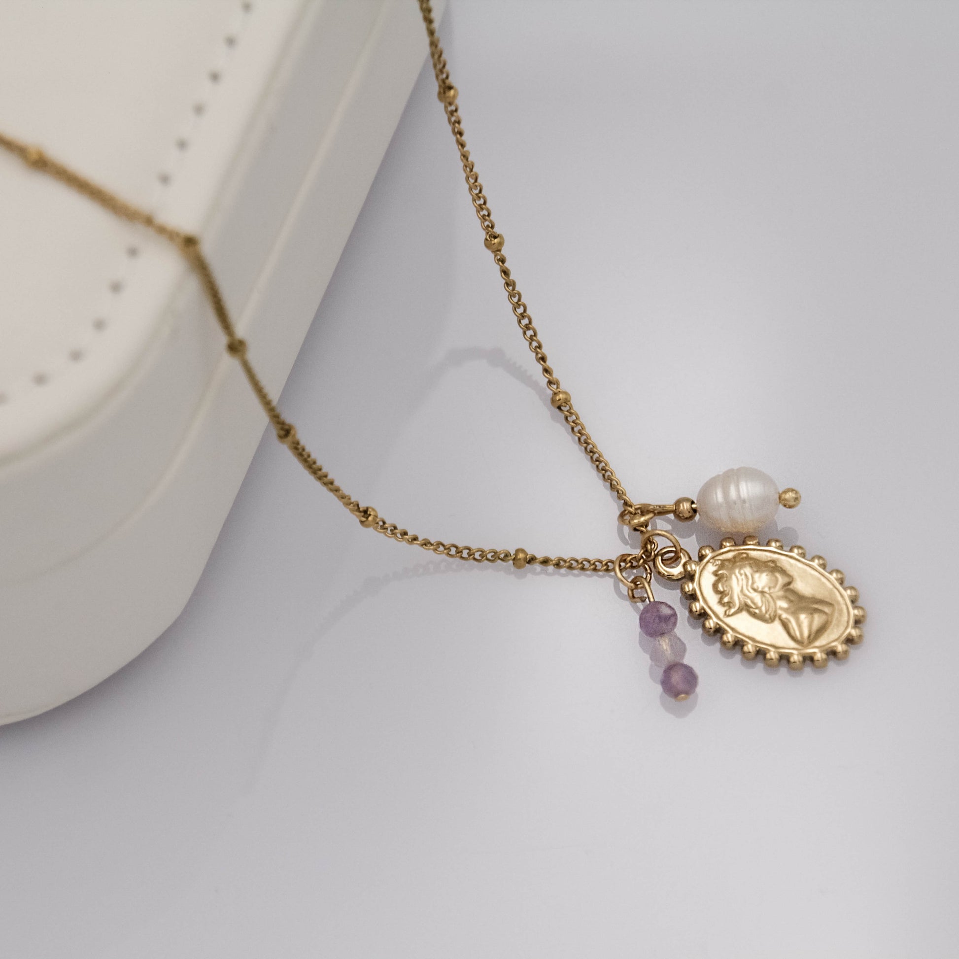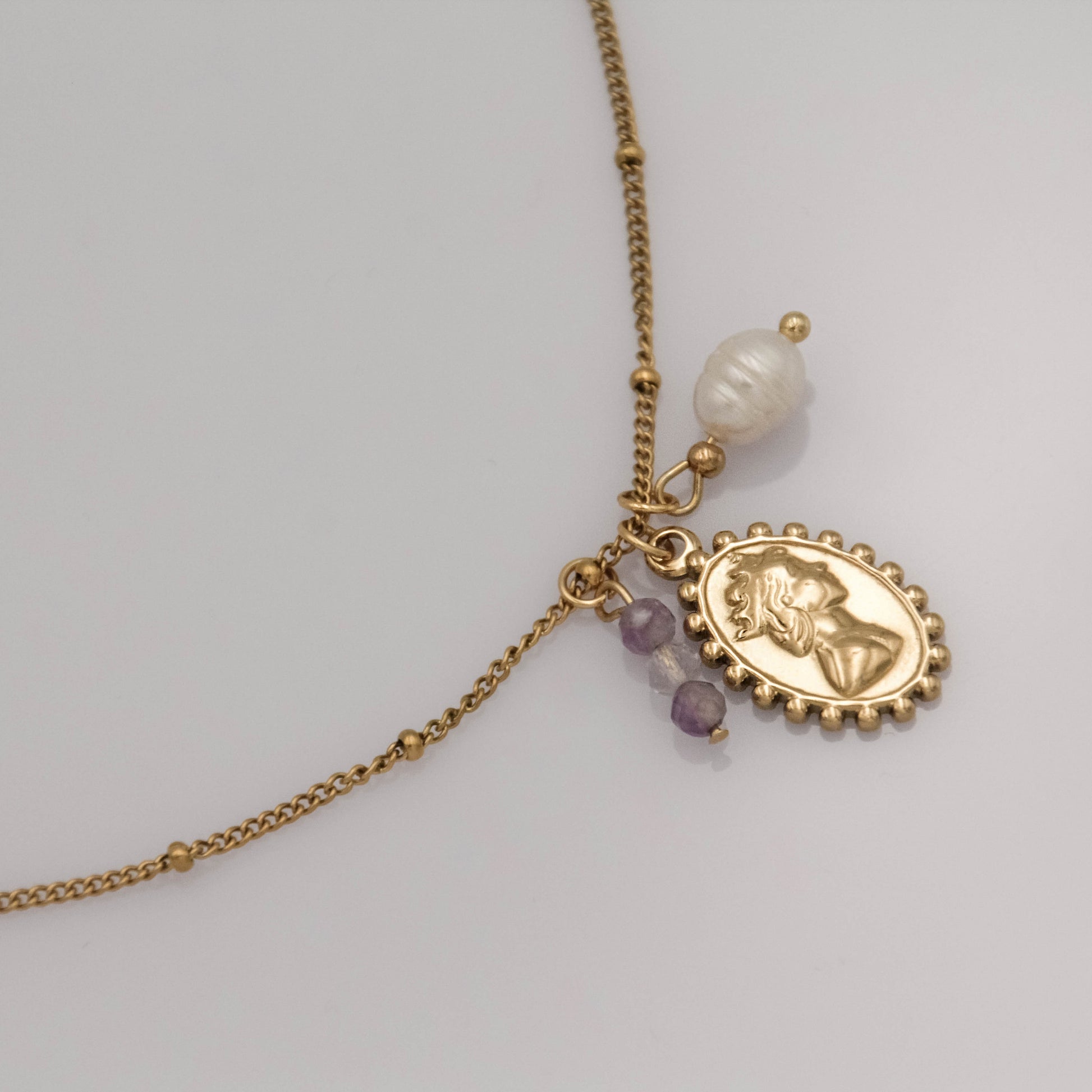 - Anyaga: aranyozott rozsdamentes nemesacél, tenyésztett édesvízi gyöngy, ametiszt.