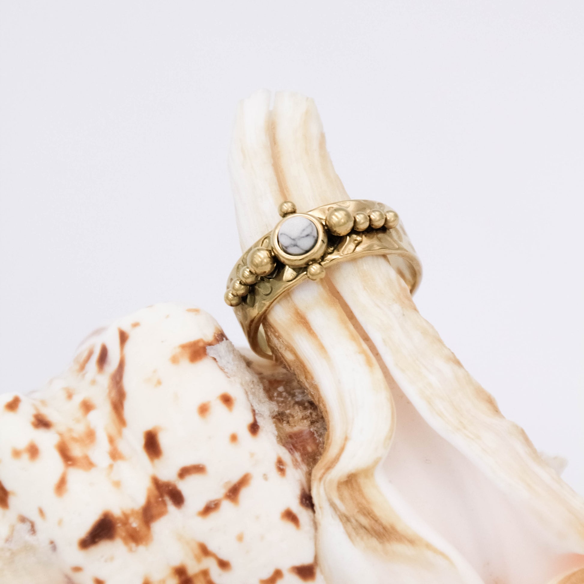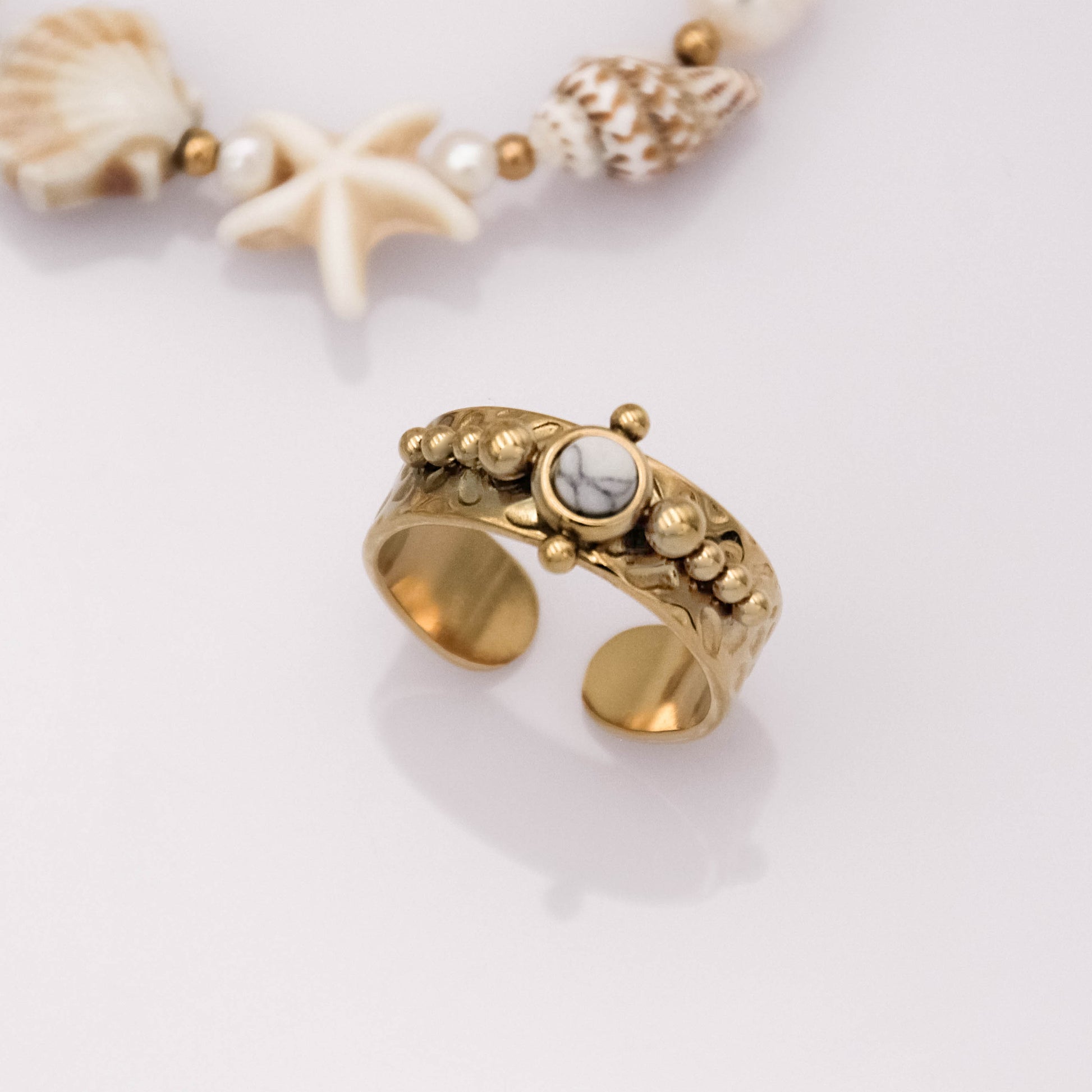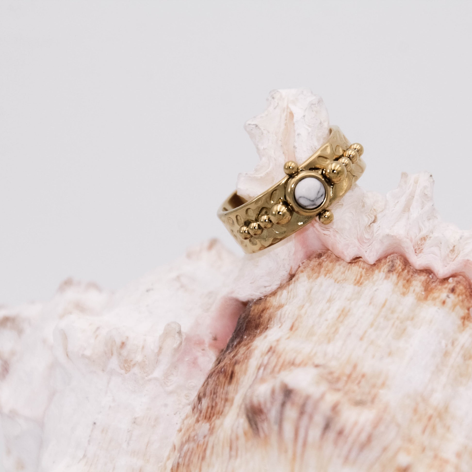 Arany színű, állítható méretű gyűrű természetes kő berakással.