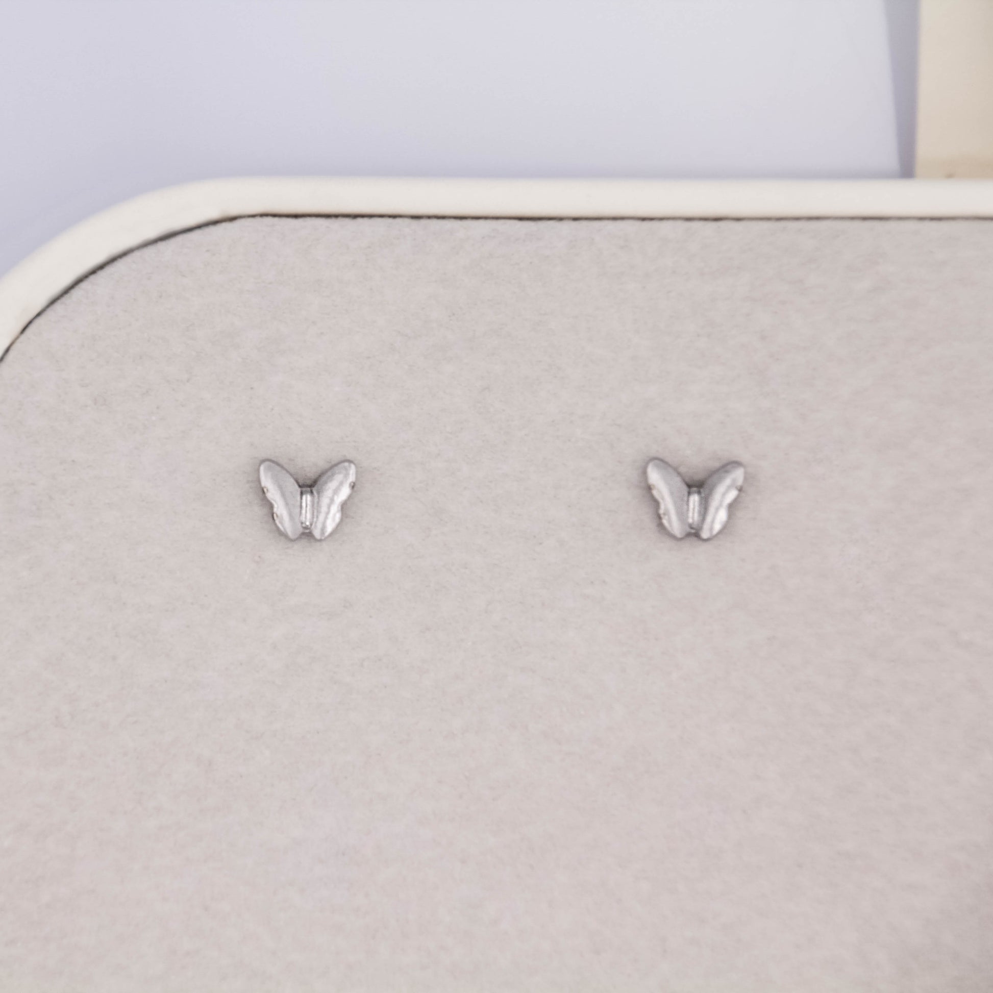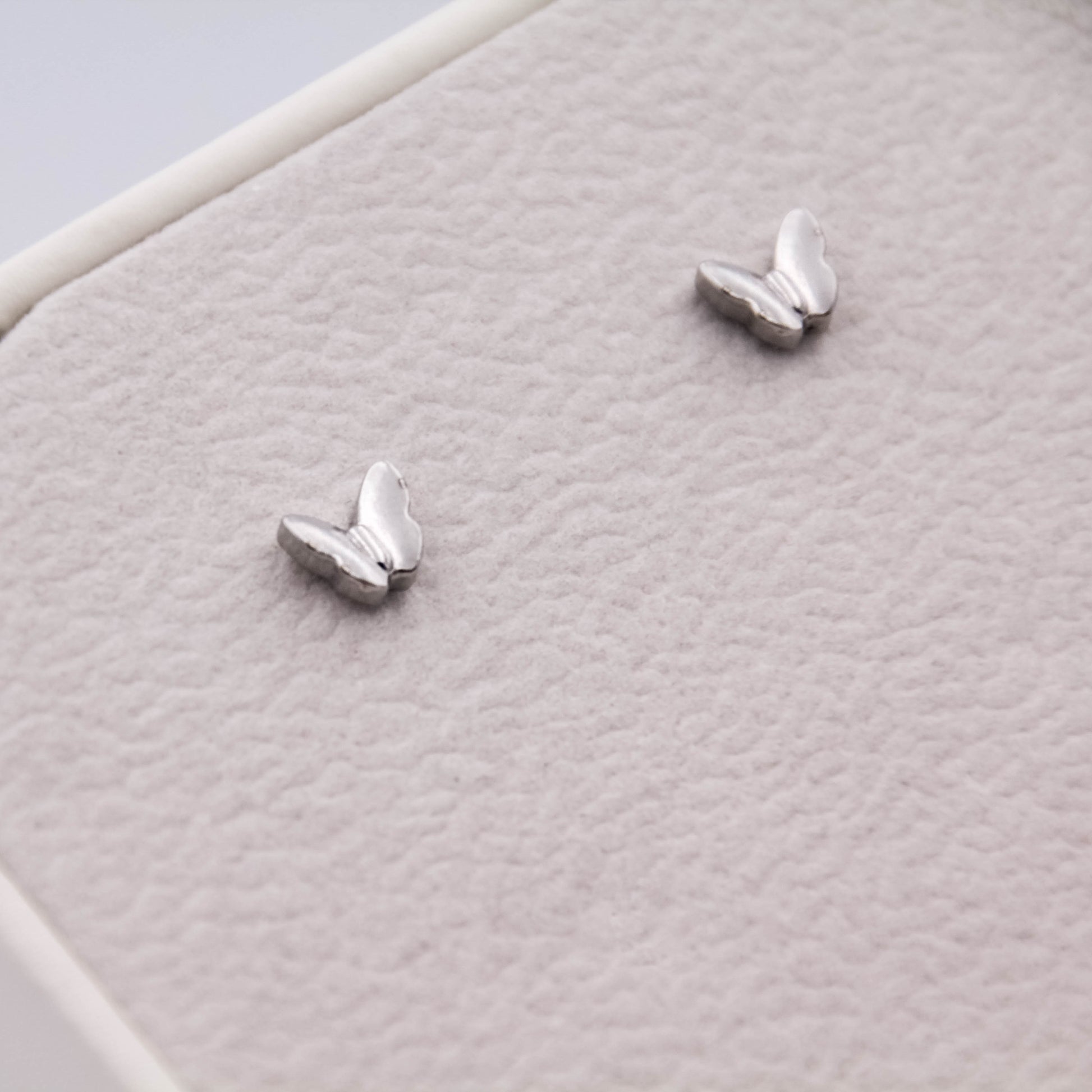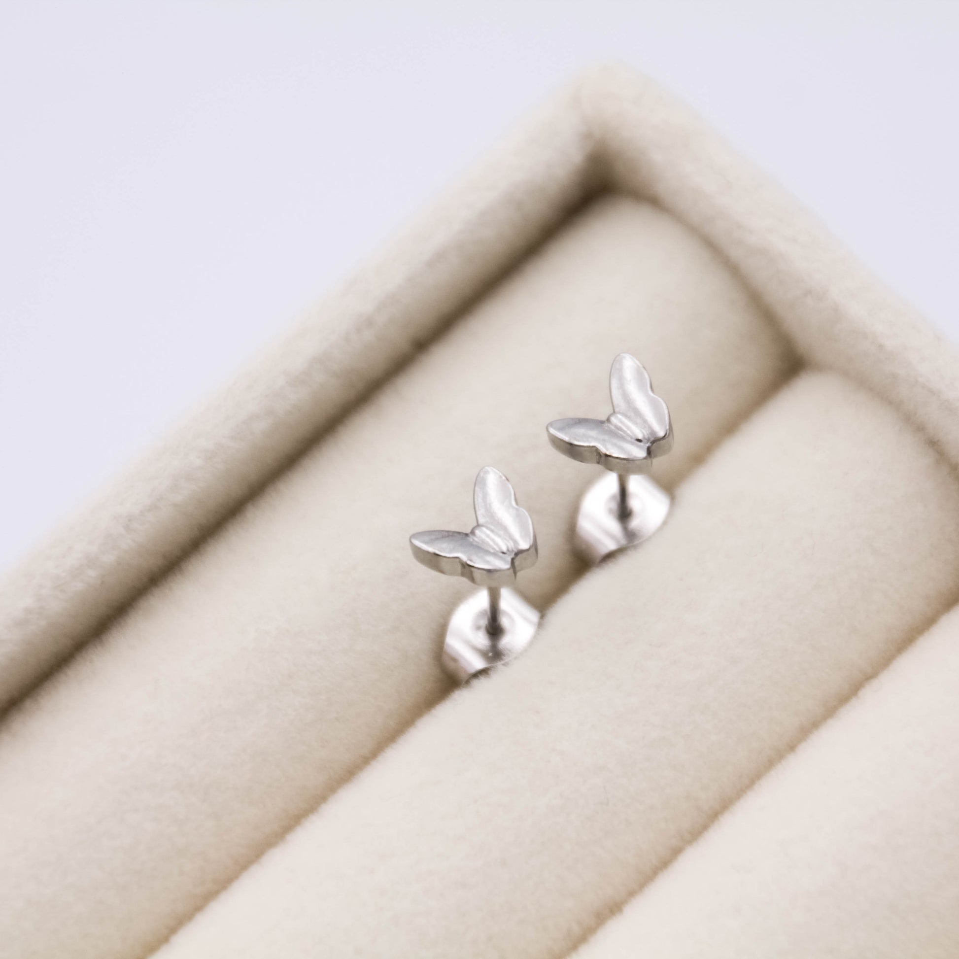 Ezüst színű "beszúrós" típusú, pillangó alakú fülbevaló.