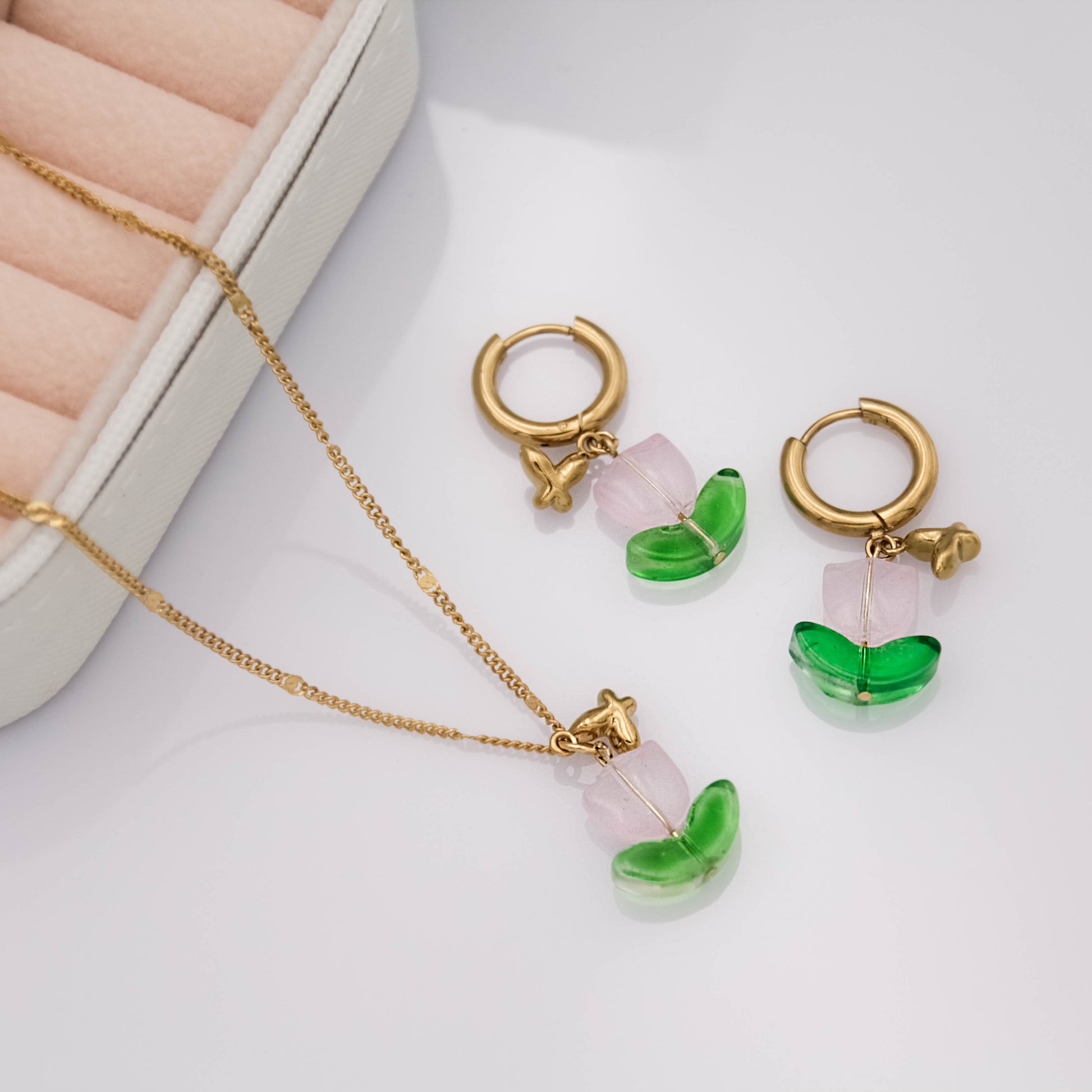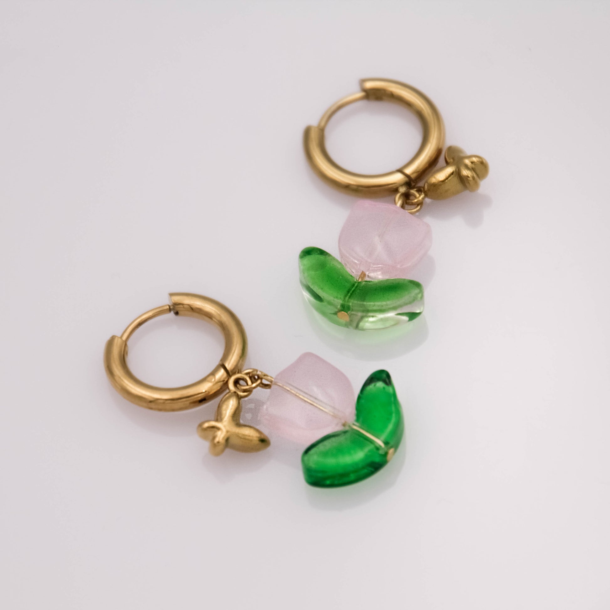 Arany színű fülbevaló üveggyöngy tulipánnal és apró pillangó medállal.