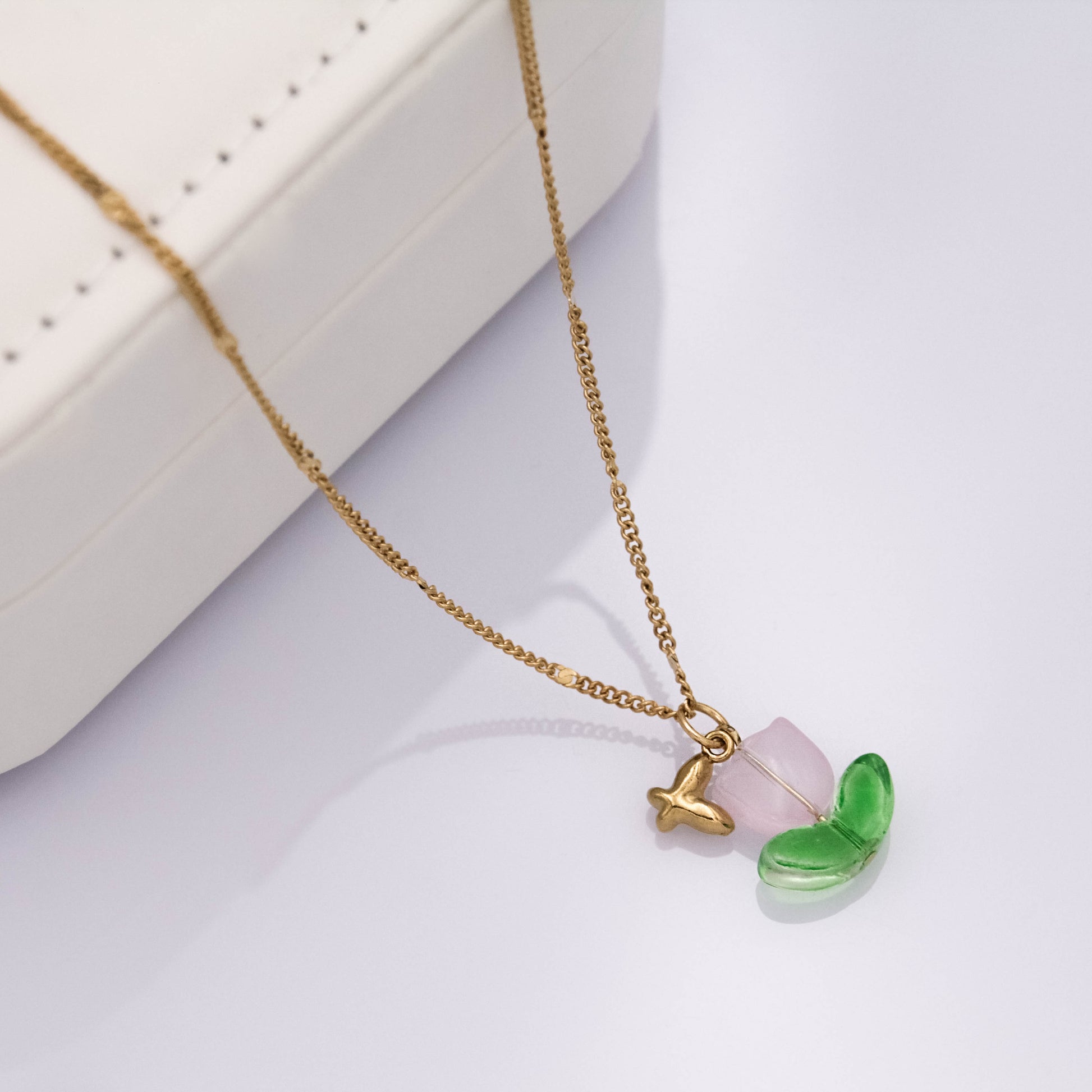 Arany színű nyaklánc üveggyöngy tulipánnal és apró pillangó medállal.