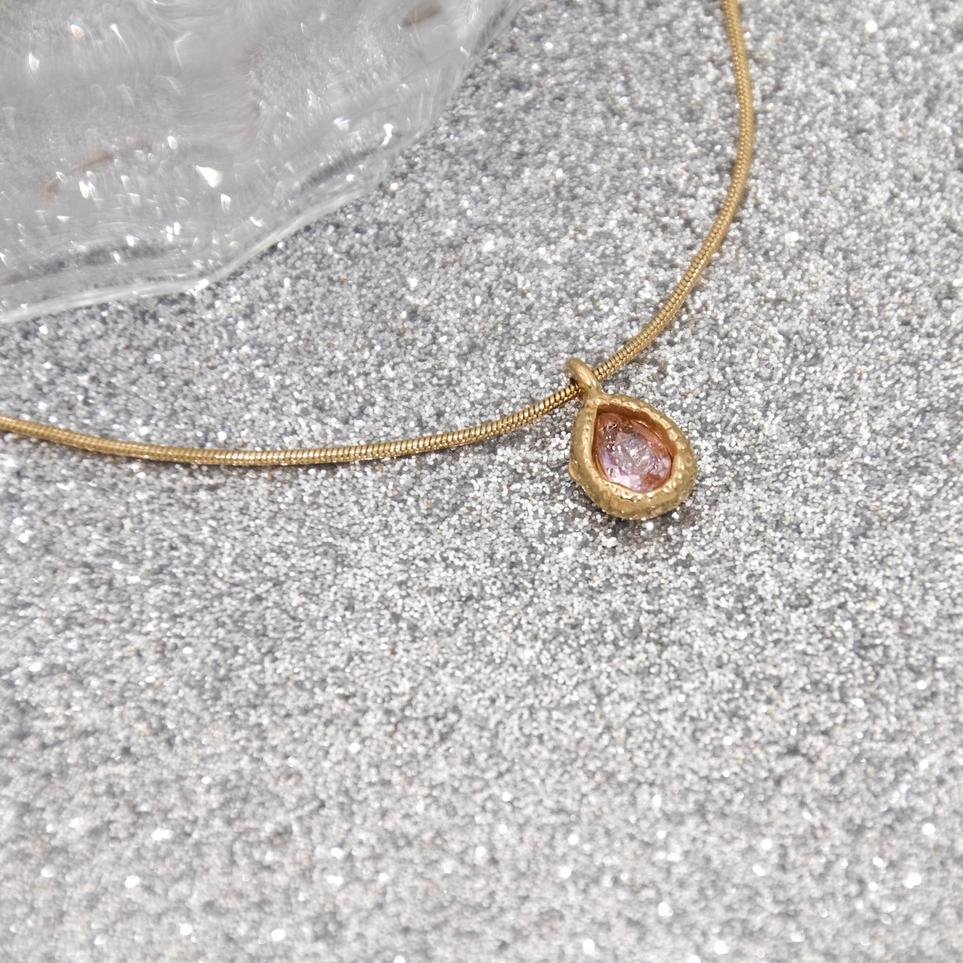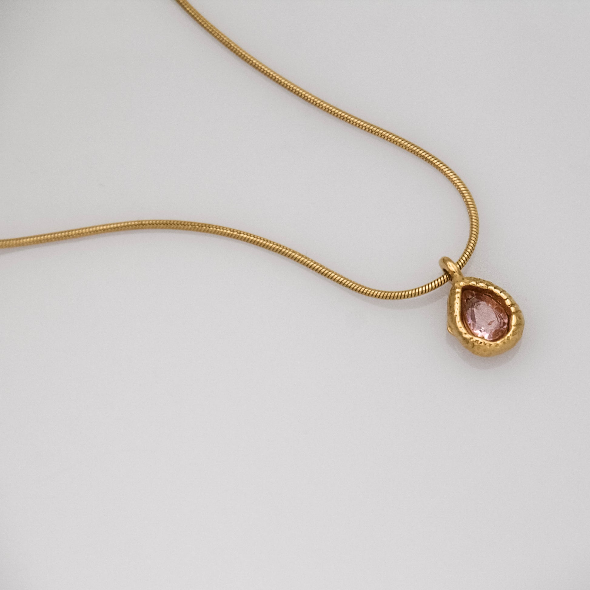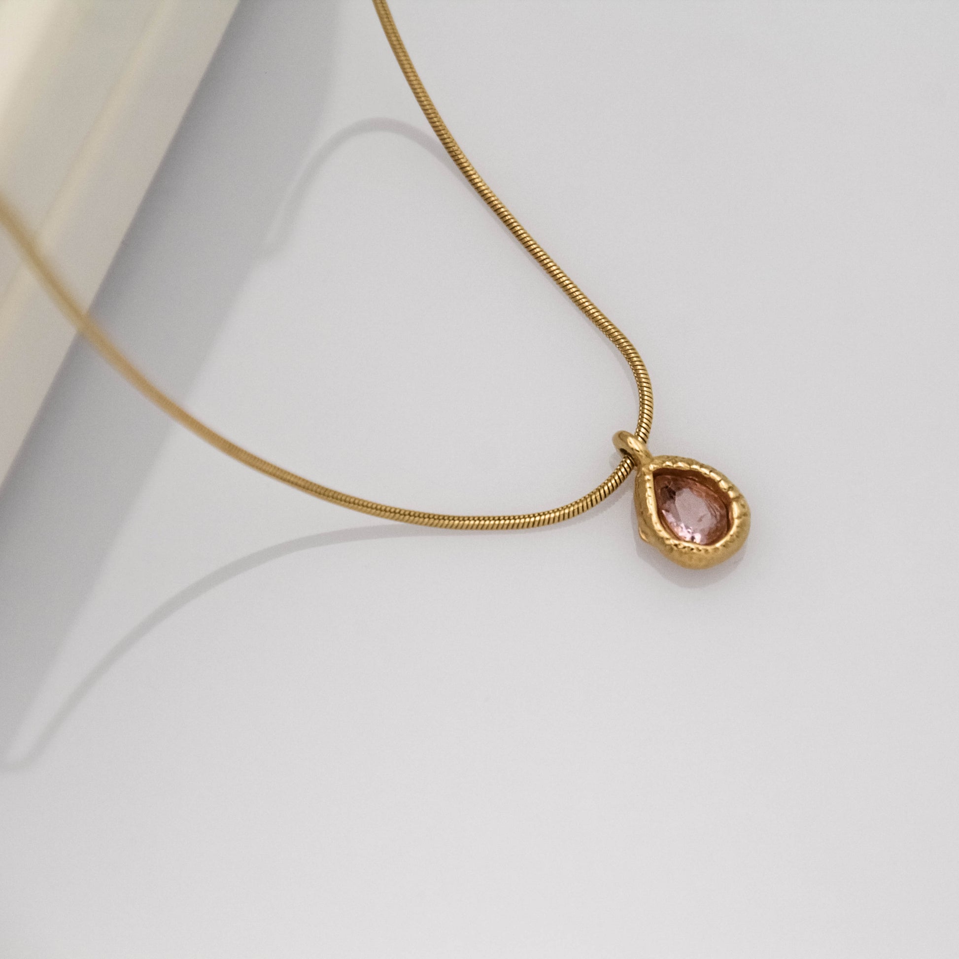 Arany színű nyaklánc csepp alakú, halvány rózsaszín kristályos medállal.