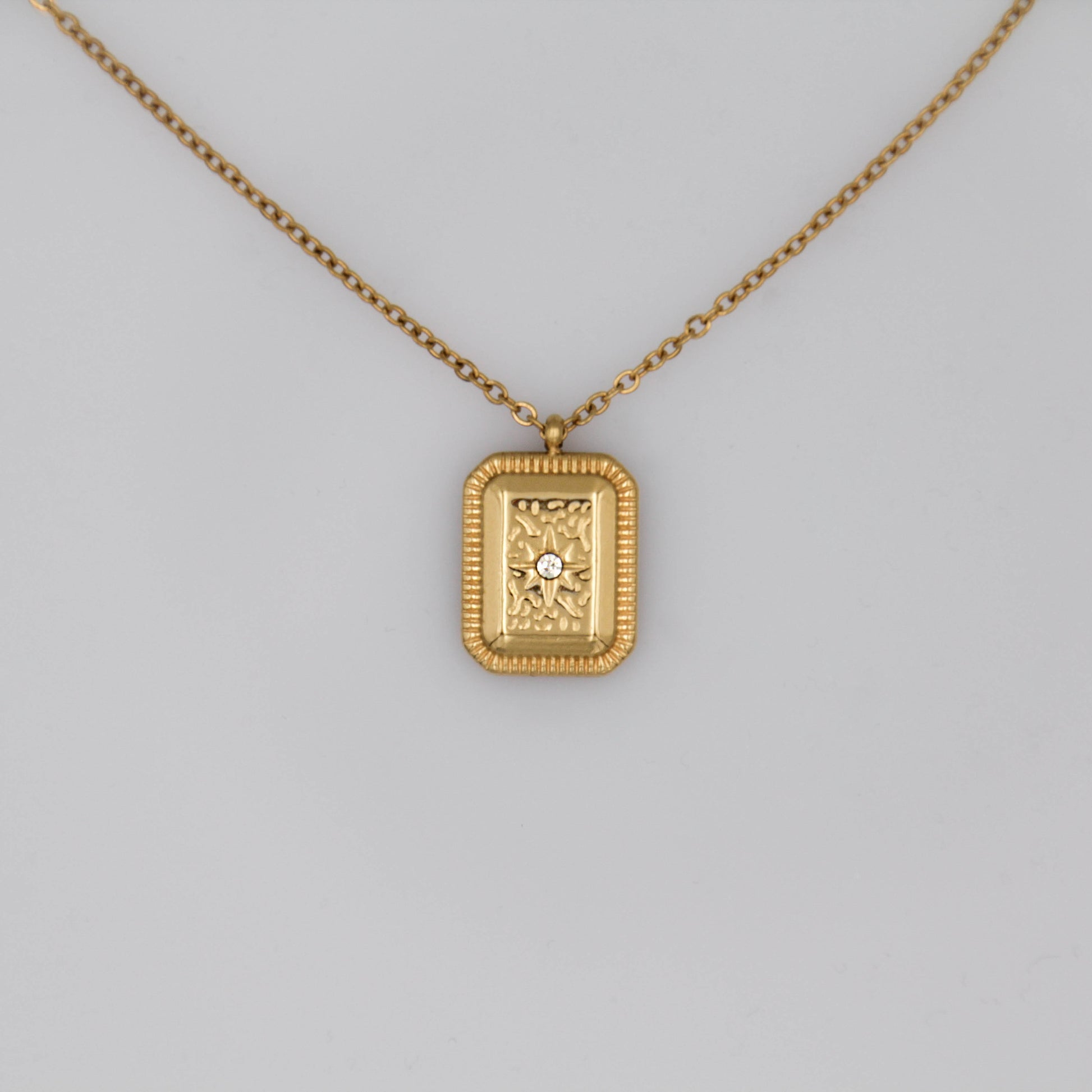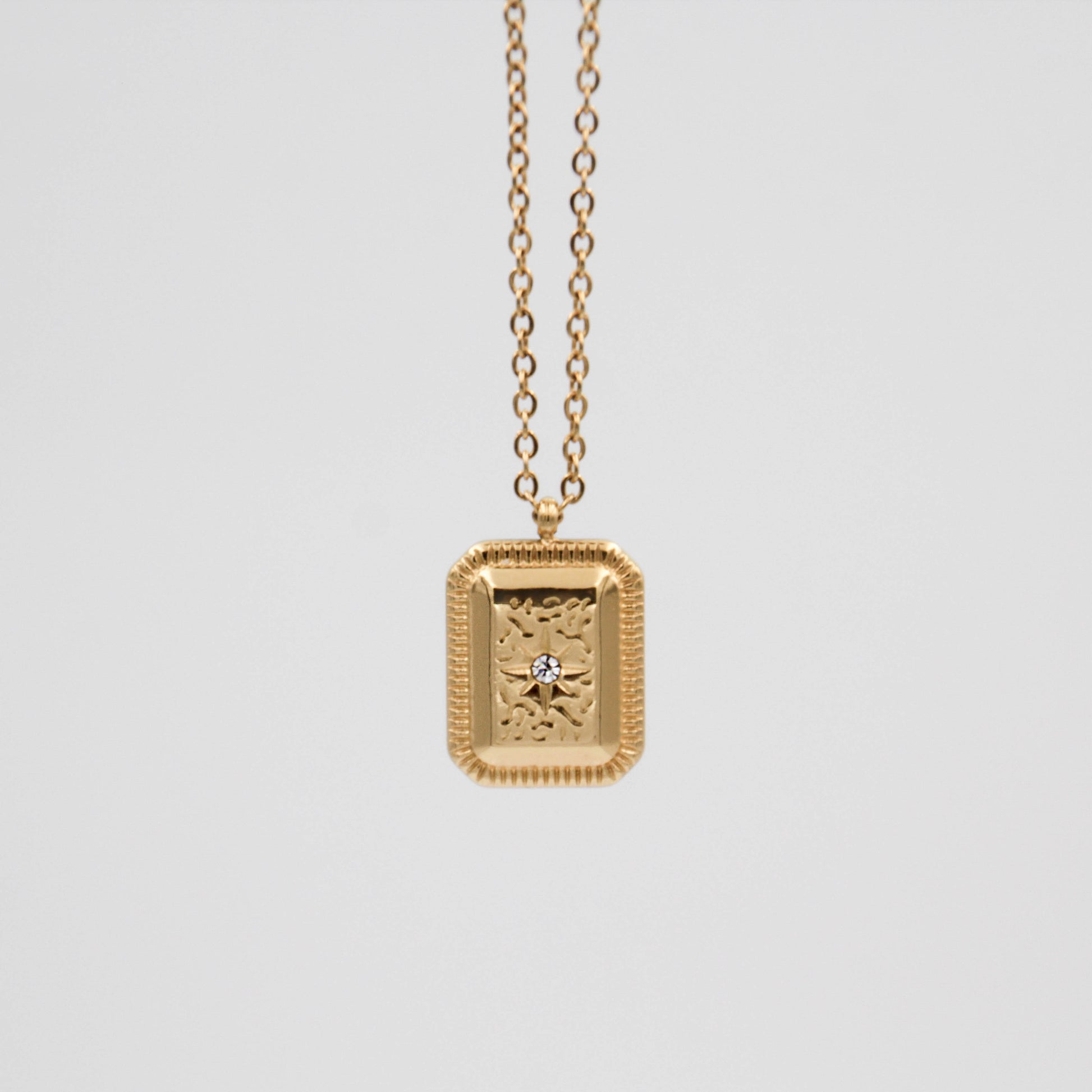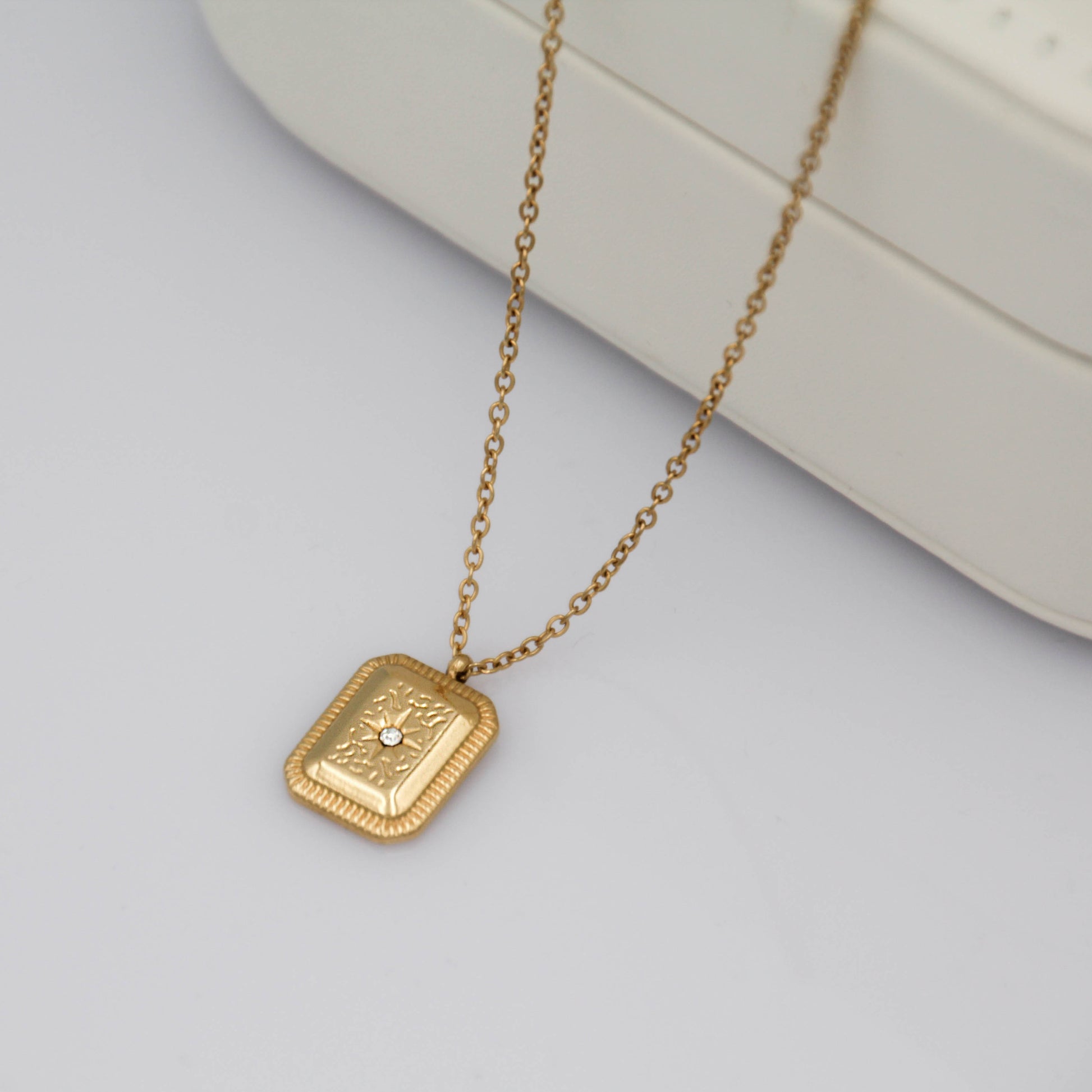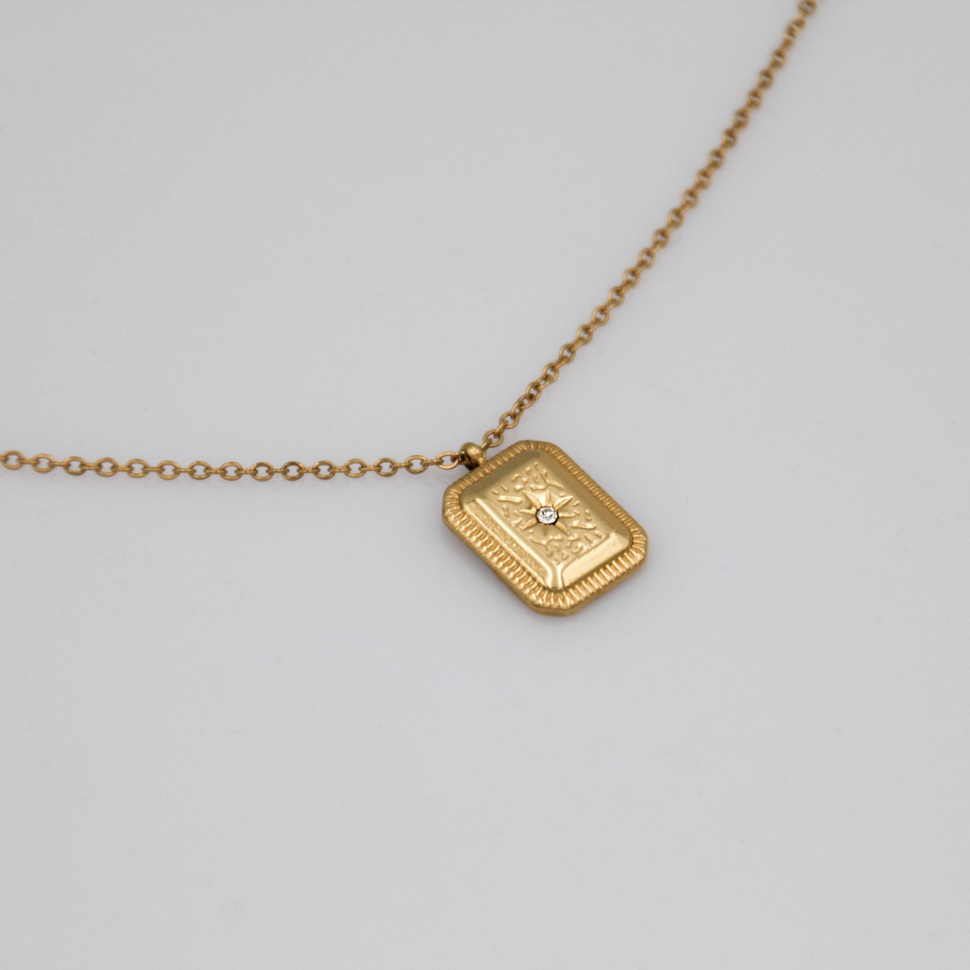 Arany színű nyaklánc gravírozott téglalap alakú cirkónia kristályos medállal.