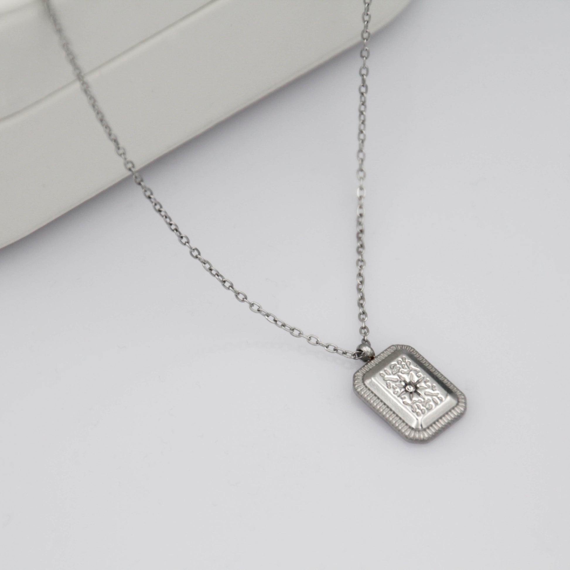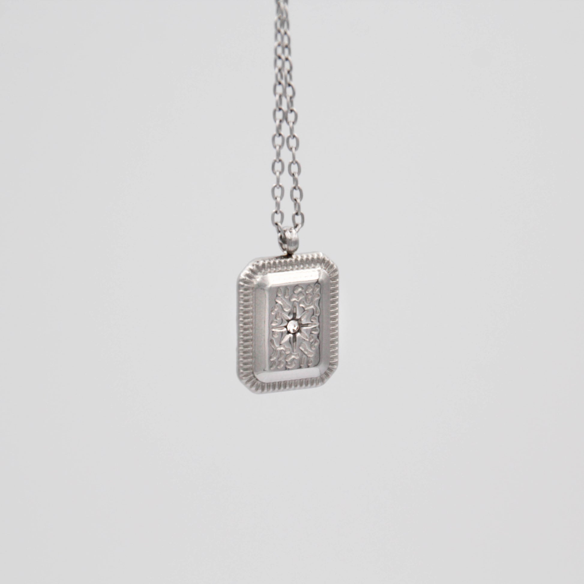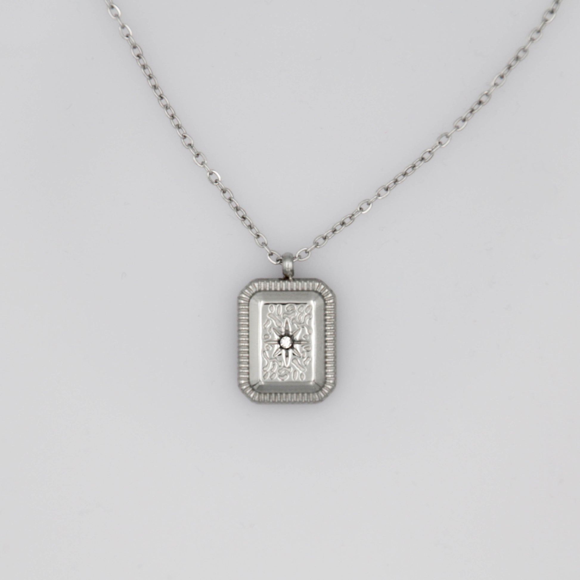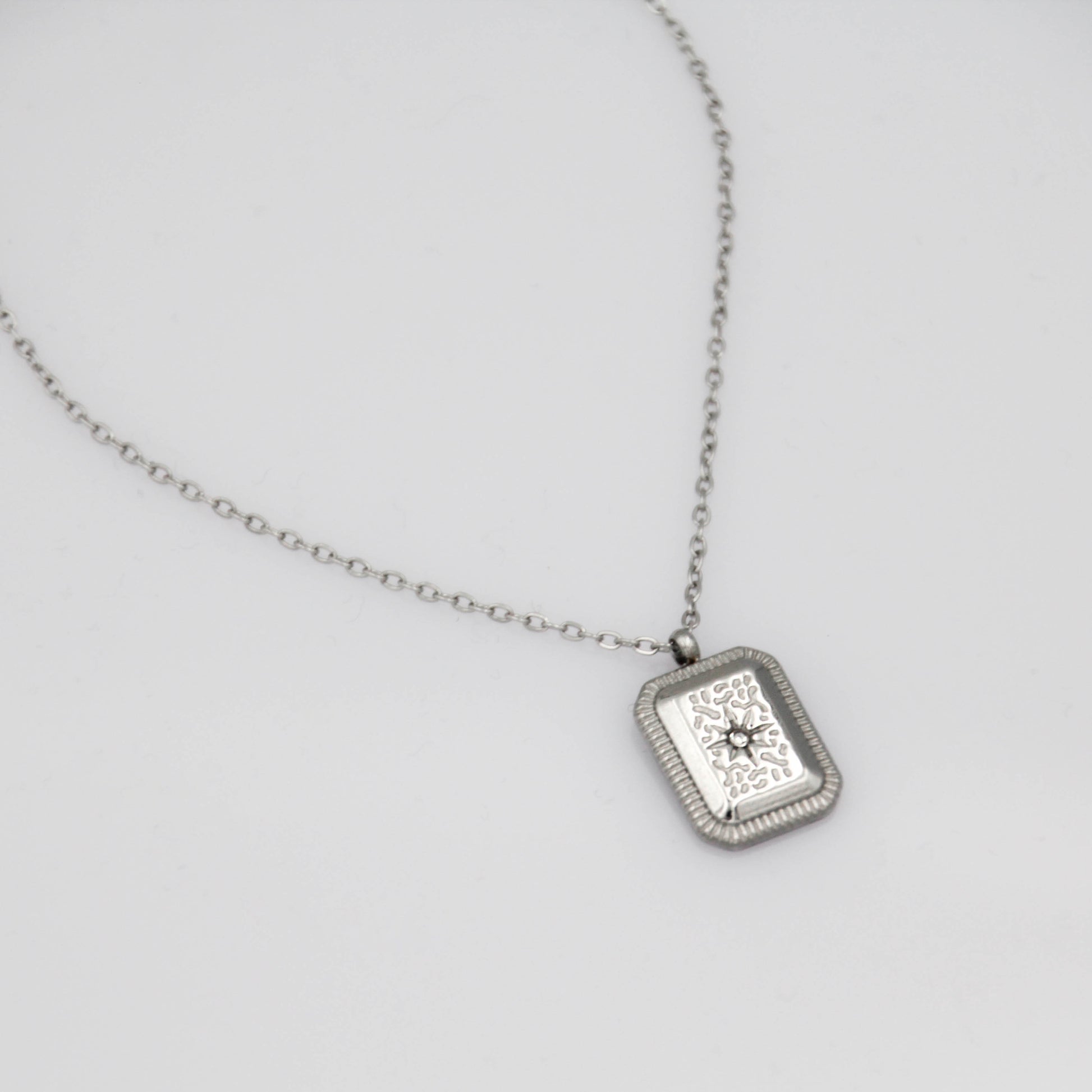 Ezüst színű nyaklánc gravírozott téglalap alakú cirkónia kristályos medállal.